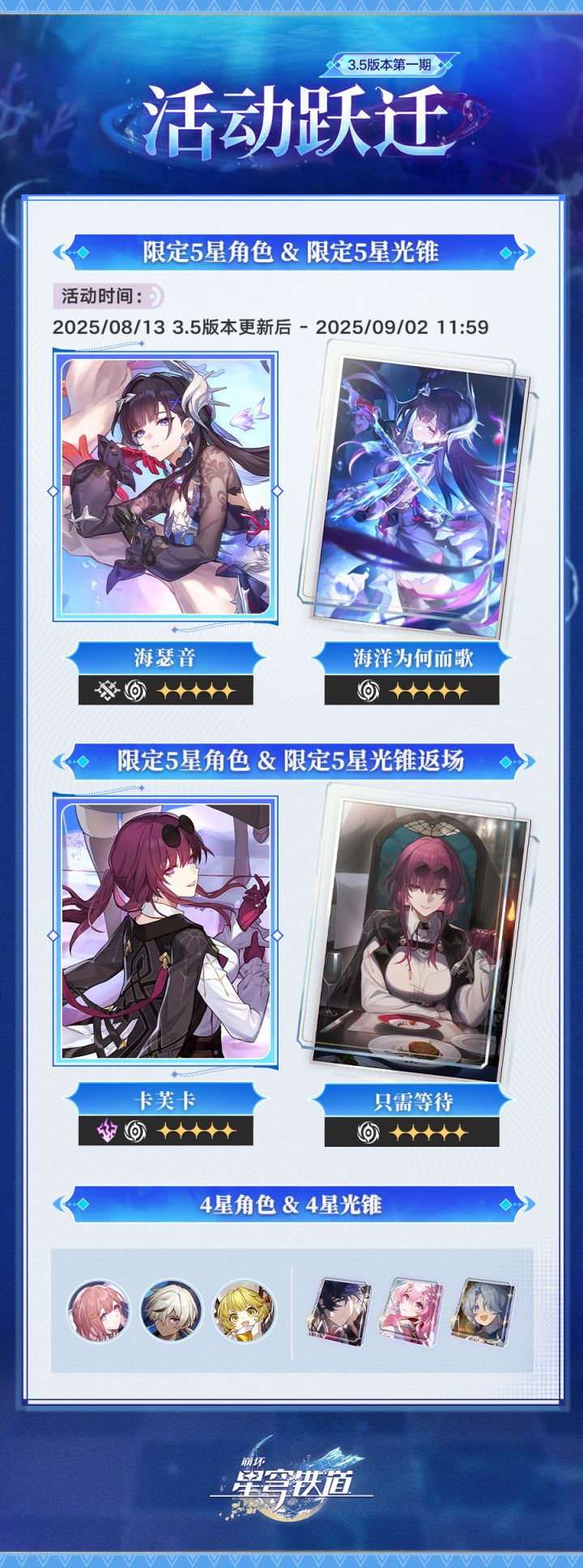 亲爱的开拓者:本期活动跃迁时间为 2025/08/13 3.5版本更新后 - 2025/09/02 11:59。限定5星角色「海瑟音(虚无•物理)」「卡芙卡(虚无•雷)」,4星角色「艾丝妲(同谐•火)」「阿兰(毁灭•雷)」「虎克(毁灭•火)」跃迁成功概率限时提升。限定5星光锥「海洋为何而歌(虚无)」「只需等待(虚无)」,4星光锥「猎物的视线(虚无)」「芳华待灼(同谐)」「铭记于心的约定(毁灭