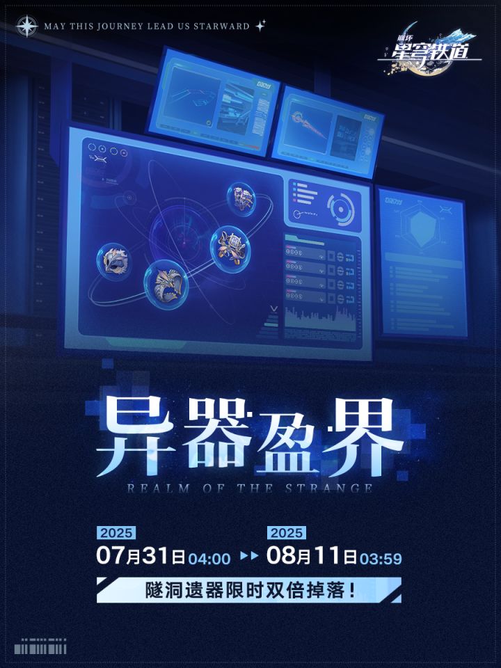 亲爱的开拓者:本期「异器盈界」活动时间为2025/07/31 04:00 - 2025/08/11 03:59。活动期间将获得一定的双倍奖励次数,挑战并通关「侵蚀隧洞」时,可获得双倍奖励。※详情可前往游戏内公告查看。