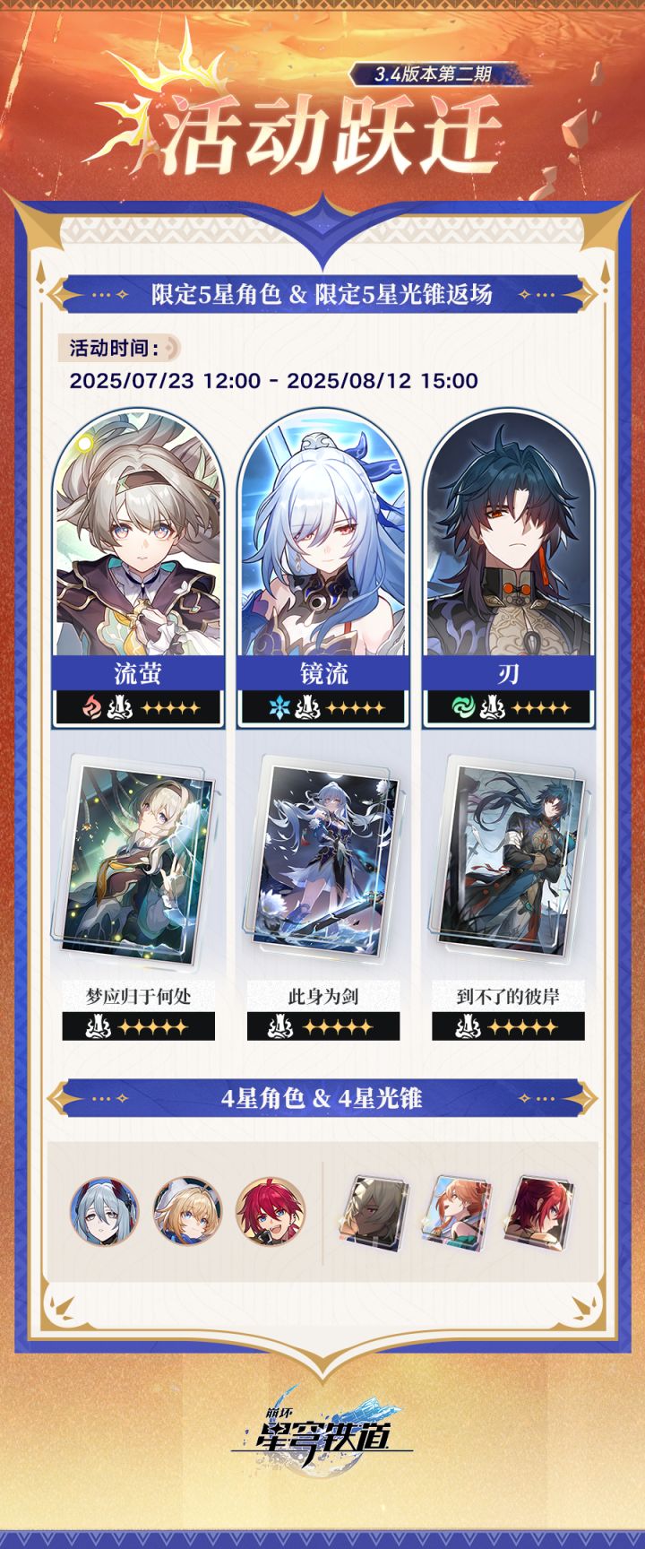 亲爱的开拓者:本期活动跃迁时间为 2025/07/23 12:00 - 2025/08/12 15:00。限定5星角色「流萤(毁灭•火)」「镜流(毁灭•冰)」「刃(毁灭•风)」,4星角色「寒鸦(同谐•物理)」「玲可(丰饶•量子)」「卢卡(虚无•物理)」跃迁成功概率限时提升。限定5星光锥「梦应归于何处(毁灭)」「此身为剑(毁灭)」「到不了的彼岸(毁灭)」,4星光锥「秘密誓心(毁灭)」「点个关注
