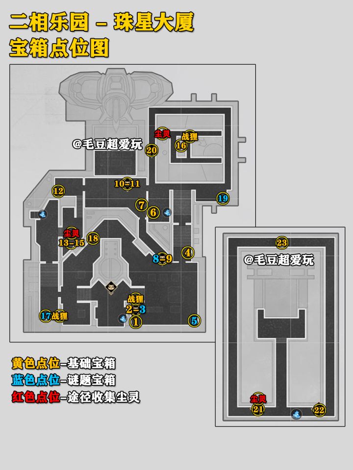 【崩坏:星穹铁道】UID:102444222上篇包含了1-18号宝箱的收集路线,19-23号收集路线请移步下篇。下篇传送门:全篇共计包含:🌟基础战利品*18🌟浮脂溯源/乐园小事*5🌟战狸品*3🌟无名尘灵*3开拓者需优先完成开拓任务《献给破晓的失控》,进行任务时自动解锁二相乐园喜笑地图珠星大厦。1.由于图片过多,该篇不包含所有尘灵的收集,后续会更新尘灵的收集路线。2.1-3号尘