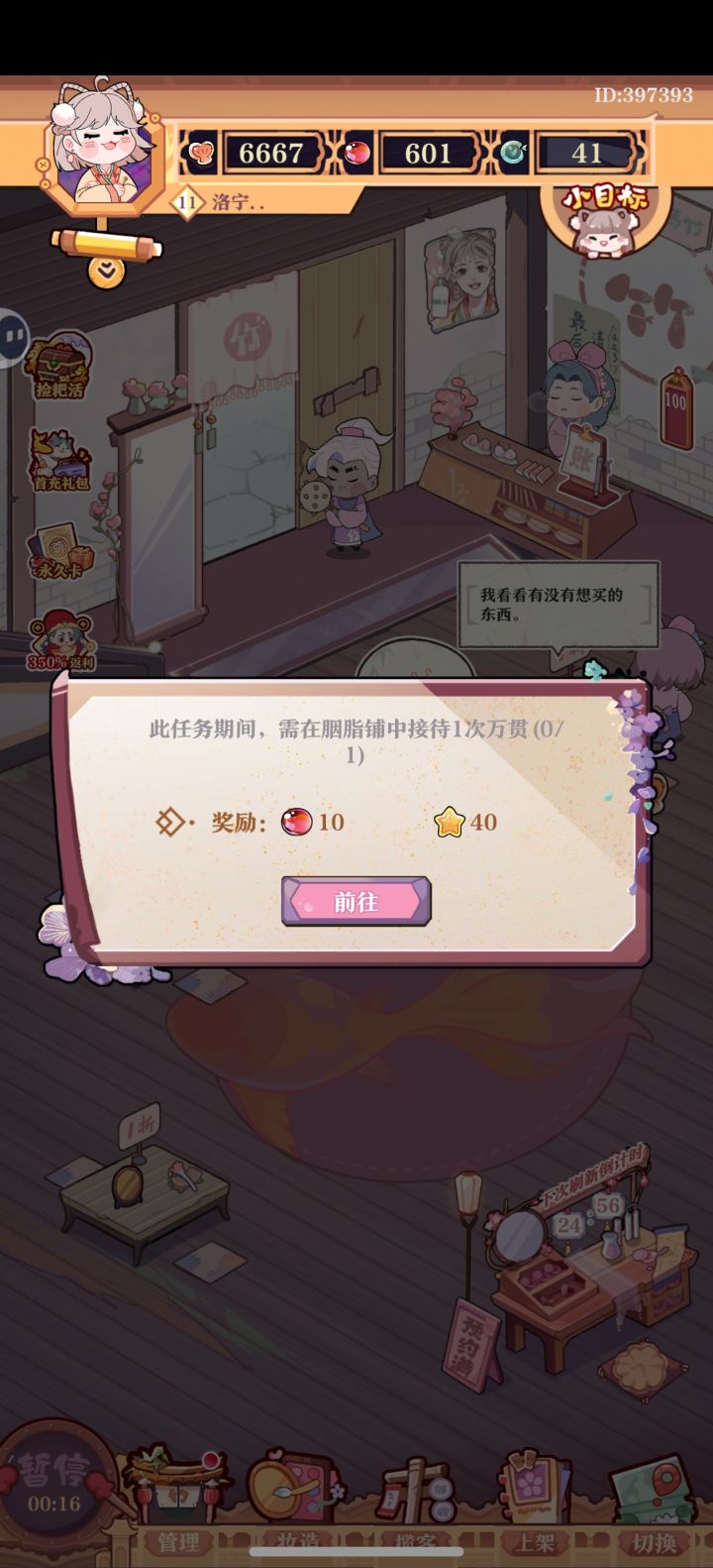 问题来源群友,有其他问题可以评论!零、通用功能1.商城2.升级人物升级经验来源:每日任务,主线任务3.故事一、胭脂铺篇1.玉勾云纹毯2.员工3.店铺升级4.限时折扣解决方法:氪金开货架or少进胭脂铺(每30min进去揽客一轮即可)or佛系 第二天就刷新了~公测这个改成了商品限量,补货只能补货单,或者第二天刷新!5.双倍6.商品7.研妆二、神颜阁篇(8级解锁)前排提