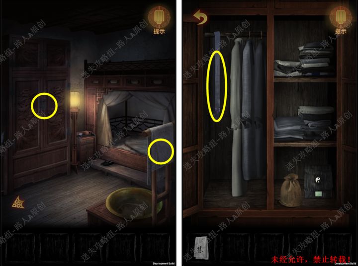 攻略作者:迷失攻略组-路人A未经许可,禁止转载,侵权必究!点击跳转: | | | | 第一章攻略1.拾取【毛巾】、【腰带】、【羊毫笔】。1.1、1.22.根据桌上《许氏秘法》的线索,按顺序敲击铃铛和鼓面,取得【鹤嘴剪】。2.13.根据桌上《许氏秘法》的线索(物品、时辰、图案的对应关系),打开柜子取得【蜡烛】、【三支香】、【香炉】。3.1、3.24.用【鹤嘴剪】剪开衣柜里的袋子#奉天白事铺