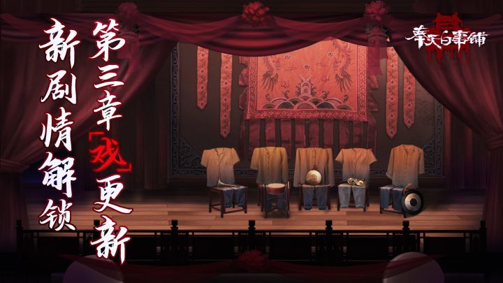 各位掌柜的大家好! 开门见山!《奉天白事铺》第三章「戏」即将解锁! 我们第一时间将更新的喜悦和兴奋带给大家! 受托解印以近为求, 无意探深藏之秘闻, 欲要减灾扫阴翳, 云雾拨开未到时, 承佑百姓安危而复...... 10月18日10:00,一同前往戏楼探寻隐藏在深处不可告人的巨大阴谋,获取此桩横死案件背后的线索,还有更多互动解谜等你体验! (PS:卸载游戏的玩家重新下载后需要