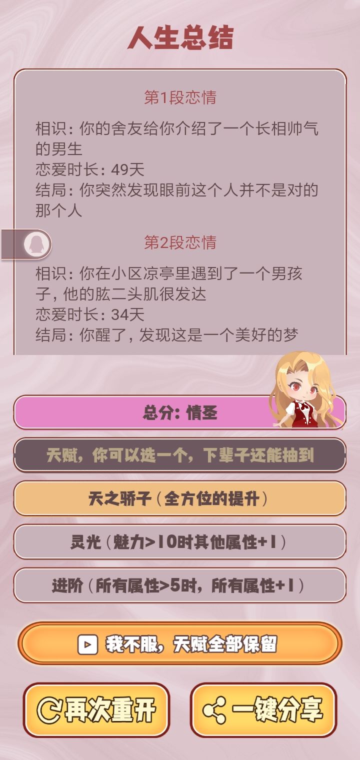 《人生重开模拟器之恋爱版》是一款模拟重生题材的游戏,如果能重生到过去,你会选择怎么样的恋爱剧情?#TapTap游戏节:夏日游戏安利大赛#游戏推荐#游戏安利