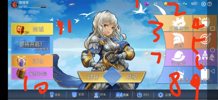 1:钻石 用于英雄抽取及商城购买 2:金币 用于兵种招募及科技研发 英雄训练 支付工资及商城购买兵种和英雄招募 3:科技研究 主要用于科技解锁和兵种加强 4:金币及魂力产量 5:训练英雄属性提升方向 6 :兵种招募 7:行政管主要用于兵种招募购买加成 8:用于观察英雄所带兵种 9:委托行主要钻石获取途径 10:话费钻石招募英雄 英雄主分为 5星金色 4星紫色 3星蓝色 11:商城购买钻石及礼包 金
