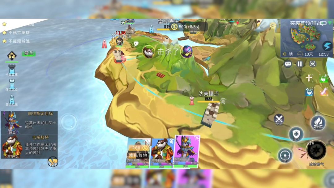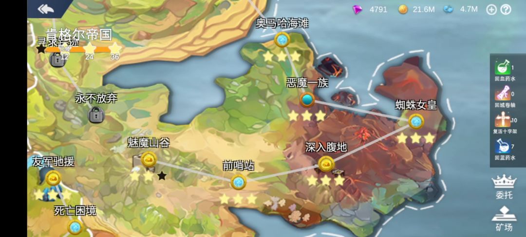 本游戏英雄种类繁多,技能各异,且版本经常变动所以这里只按照英雄属性,进行队伍搭配推荐,具体搭配也需要玩家慢慢体验技能。前期副本开局1500金币左右,只能出一个英雄,所以需要一个攻击高、打城快的英雄(占领城池可获得金币快速出战英雄)。城池防御分为城防、驻军。如下图黄色为城防,城防为0后对驻军有攻击加成,攻击城防最有效的是炮车,其数量战术挂钩城池名称下方数字为驻军数量,数量为0时,可对城池进行