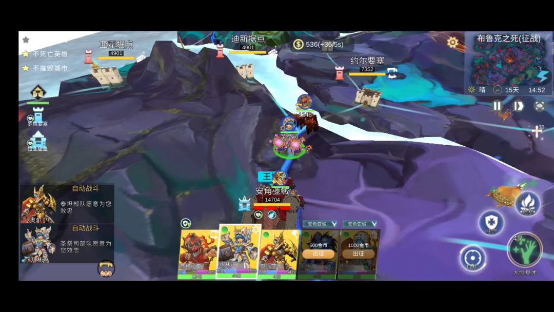 本游戏英雄种类繁多,技能各异,且版本经常变动所以这里只按照英雄属性,进行队伍搭配推荐,具体搭配也需要玩家慢慢体验技能。前期副本开局1500金币左右,只能出一个英雄,所以需要一个攻击高、打城快的英雄(占领城池可获得金币快速出战英雄)。城池防御分为城防、驻军。如下图黄色为城防,城防为0后对驻军有攻击加成,攻击城防最有效的是炮车,其数量战术挂钩城池名称下方数字为驻军数量,数量为0时,可对城池进行