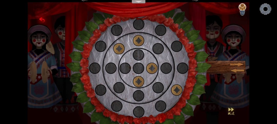移动铜钱时,我的思路是 先确定外圈的四个,对角线两个为一组, 通过移动木条和转动圆环,使两个铜钱在同一直线且中间差三个格子, 然后通过移动木条使确定好的两个铜钱移动到第二个圆环, 接着确定下一组时,把已经确定好的铜钱转动到垂直方向,使第二组所在的直线与其形成直角, 最后在将四个铜钱转动到正确方向,然后确定圆心就可以啦… (啰嗦了一堆,可能听不懂,看视频吧🌝)