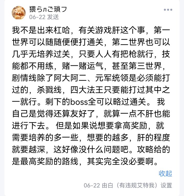 挂一个人吧,楠木空城既然他在论坛上挂我了,我挂他没毛病吧,我就是他说的管理无言,他在一个月前在官方群里公然讨论脚本外挂,甚至引以为傲,跟我算是吵了一架,可以说是满屏翻我族谱,最后引发众怒,一个人舌战群儒,被别的管理禁言一个月。(我当时还不是管理)这一个月来享受着群里不断更新的资源,看着我写的攻略,解除禁言之后还出来挑事,说不用脚本玩不了,第一个图是制作人解释关于游戏肝的话,明眼人都能看懂,不开