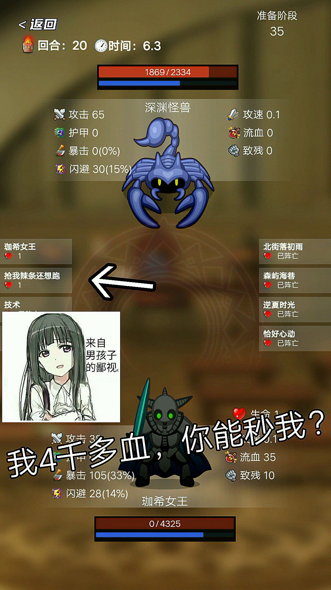 2.解决高等级"苦肉"技能导致玩家血量为负数的bug,现在改为最低下降到1 (大胆猜测一下,是不是有人可以配合高闪避,玩抢攻)