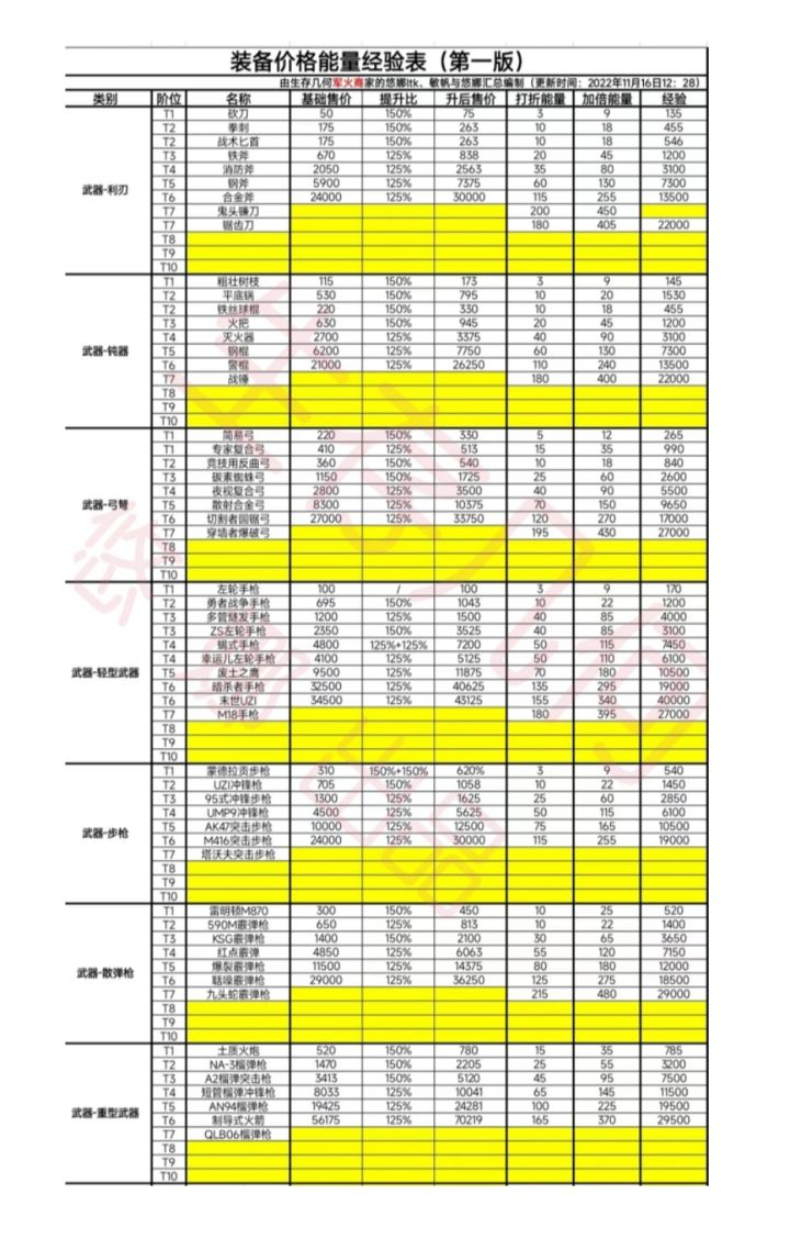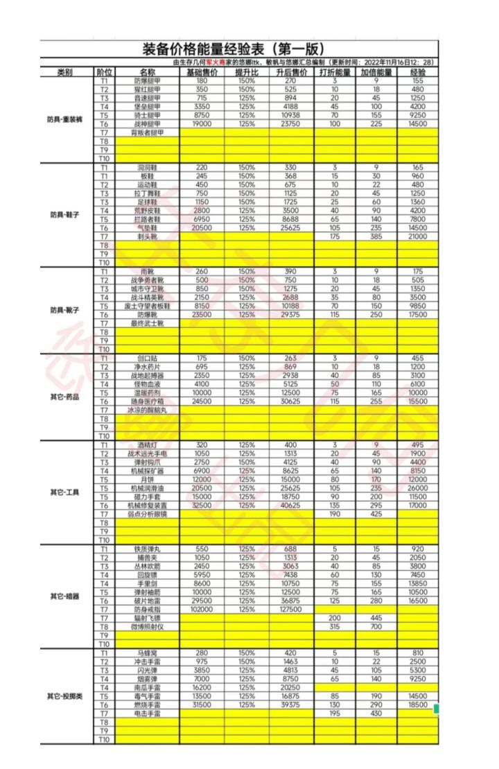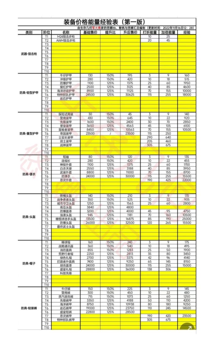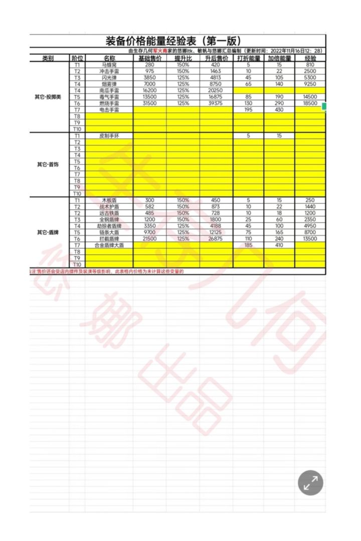 【萌新必看】专为萌新们写的哟😘~最后补一个表格~纯手工摘录的数据~😂附件01:装备价格能量经验表(第一版)