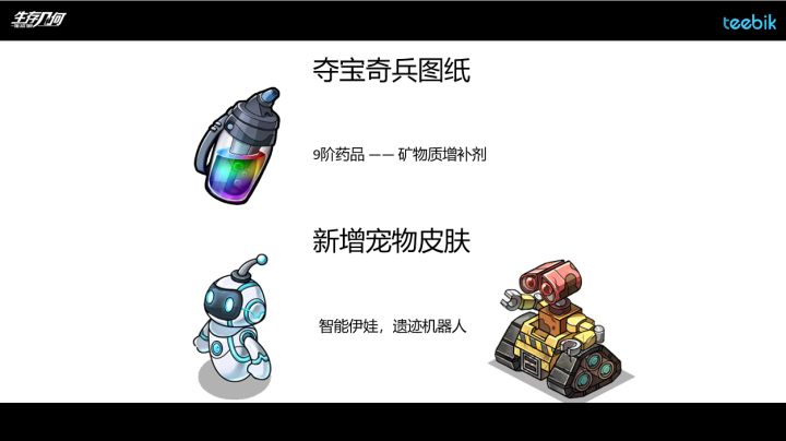 致亲爱的店主5月19日将在线更新以下内容,敬请关注。1.夺宝奇兵活动:[开启时间]5月22日12:00-6月1日11:00[新增图纸]9阶药品,矿物质增补剂2.专享礼包-520甜蜜礼包将于5月19日12:00更新。[新增宠物皮肤]智能伊娃,遗迹机器人[新增图纸]6阶图纸,指挥官的外套3.专享礼包-家园重建礼包将于5月19日11:00下架;如有问题您可通过游戏内“邮件”-“问题反馈