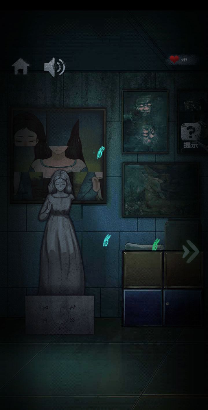 这游戏需要实名和身份证号也需要联网,否则无法进入游戏,也无法看广告获取体力值和提示。进入游戏有个跳过引导按扭,点下,就能安装女孩雕像的断臂了。不点则无法安装女孩雕像的断臂。点⏩移动到点靠女孩雕像右边第三个柜子点手臂雕像点⏬退出来点⏩到点窗帘下边长笛雕点窗户,把窗帘⬅️➡️拉开。点⏪到点镜子点钥匙点⏪到点钥匙点有钥匙孔的柜子点花瓶雕像点⏬退出来点女孩雕像触发林幼琪的