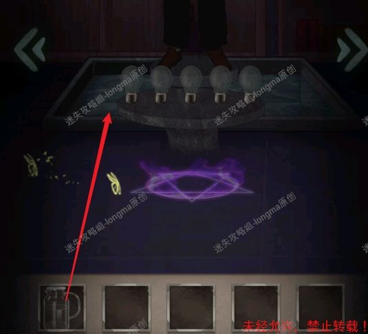 ✅第三章 攻略58.向右来到第三个房间,点击书架上的水壶,得到【空水壶】。5859.来到中间房间,使用【空水壶】在水池中打满水,得到【装满水的水壶】。5960.在书柜右侧得到【蜡烛】,左侧得到【打火机】。6061.来到第一个房间,对左边雕像使用【装满水的水壶】,对右边的雕像使用【蜡烛】并用【打火机】点燃,两个雕像都变的透明,并使中间屋子中前两个灯泡变亮。6162.点击第一个房间篮球上方的