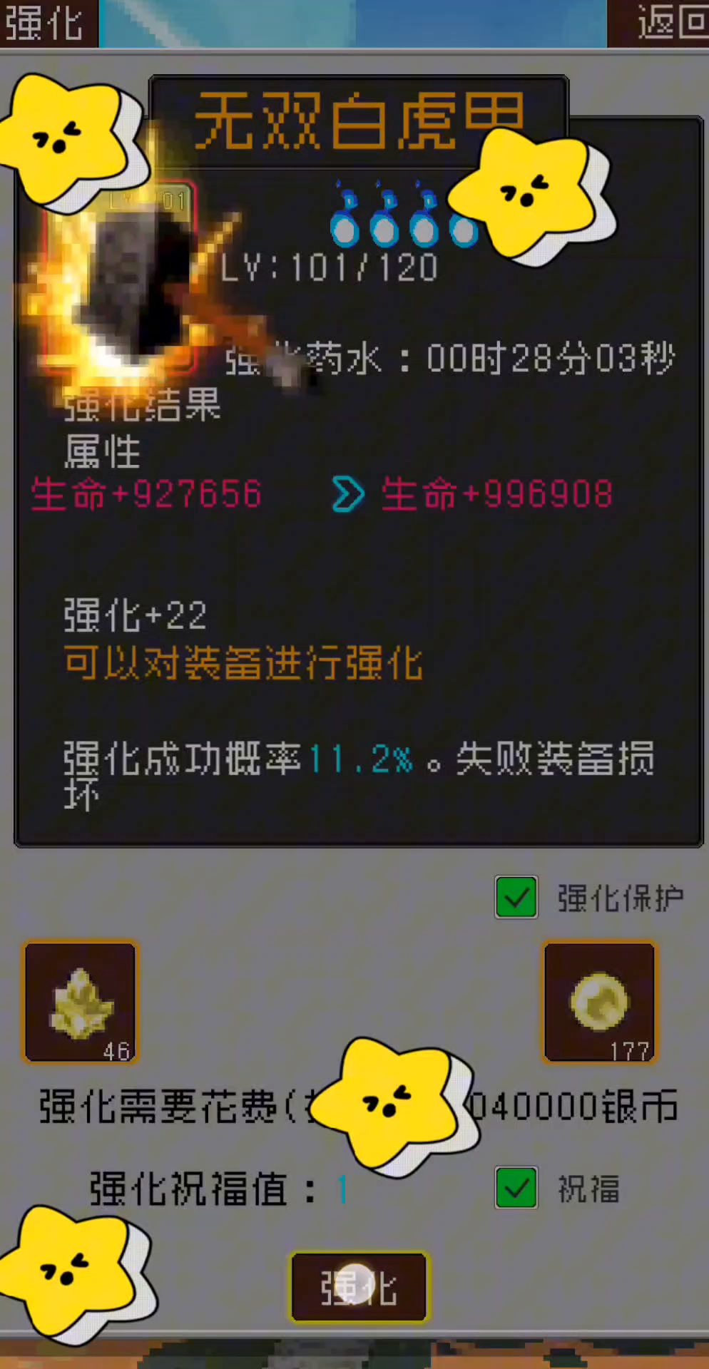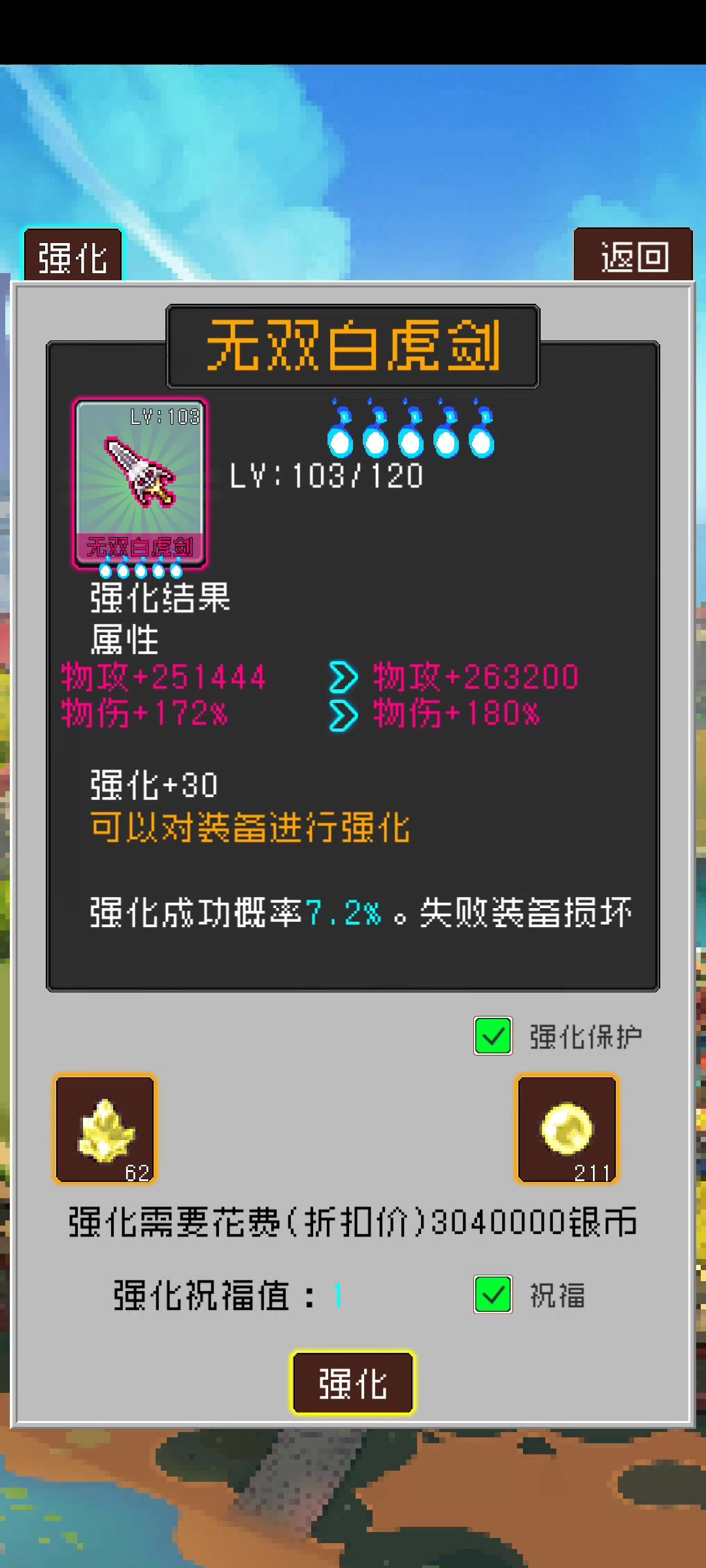 终于强化满级了。强化比较坑的一点就是每一级强化属性是等量增加。而不是递增,越到后面越不划算,一般有个强20就好了,在后面概率低,有点费资源。而且换装备,强化不会换。到后面120级才会给毕业装,所以没必要死肝31强化的。#攻略#游戏讨论#游戏推荐#游戏资讯#游戏安利