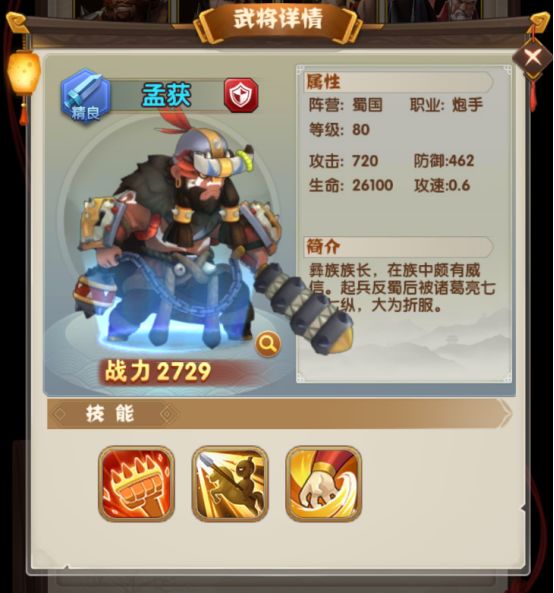 武将攻略第十期这次小婵带来第十个武将—孟获。孟获,前期攻速加速小马达,虽自身伤害不高,但加速效果可给队友提供不俗的攻速效果加成。他的加速甚至要高于刘备,是前期过度和小R不可缺少的武将,无论是推图还是pvp,均有不错效果。如果发现了这匹黑马,小伙伴们快用起来吧~武将获取途径:酒馆抽取、雅间抽取,碎片合成随机获取,阵营自选礼包也有概率获得该武将。