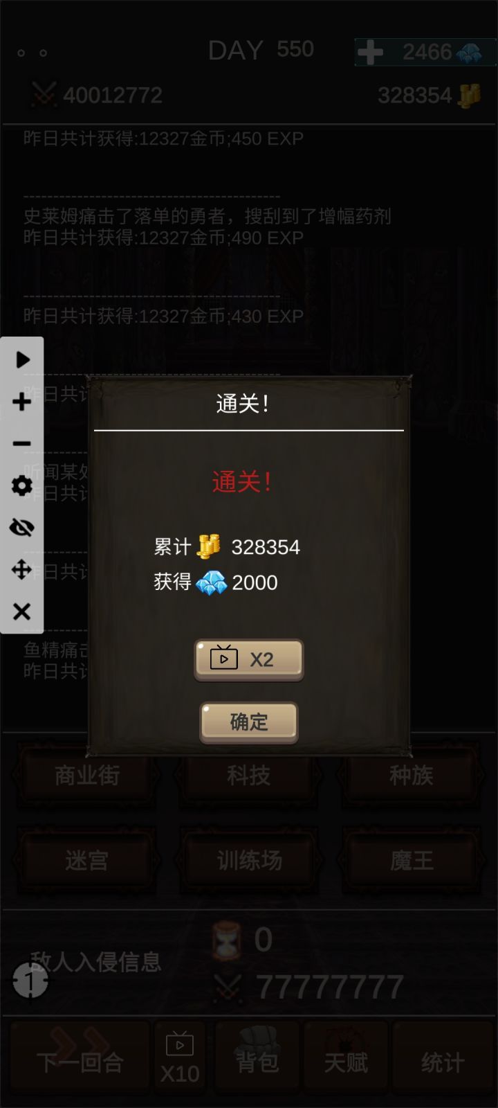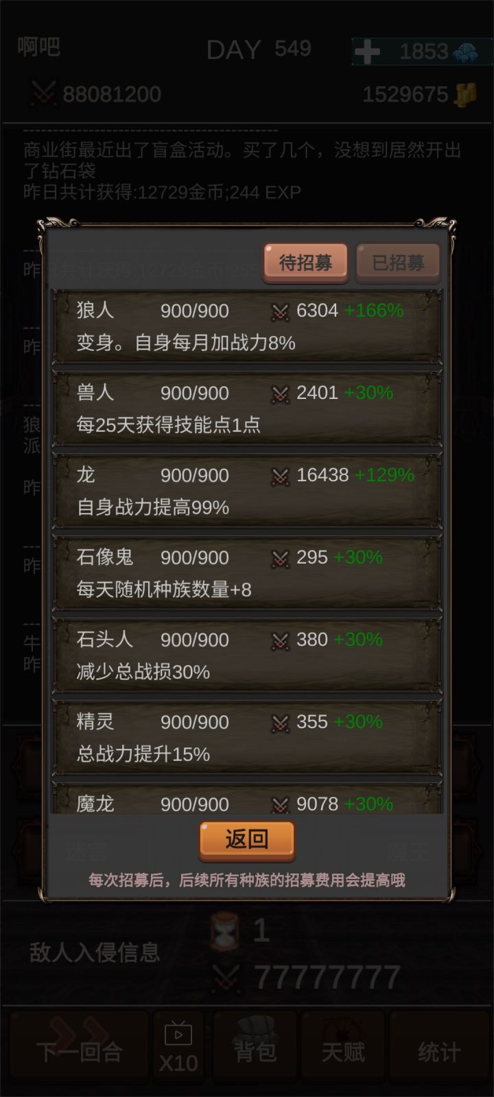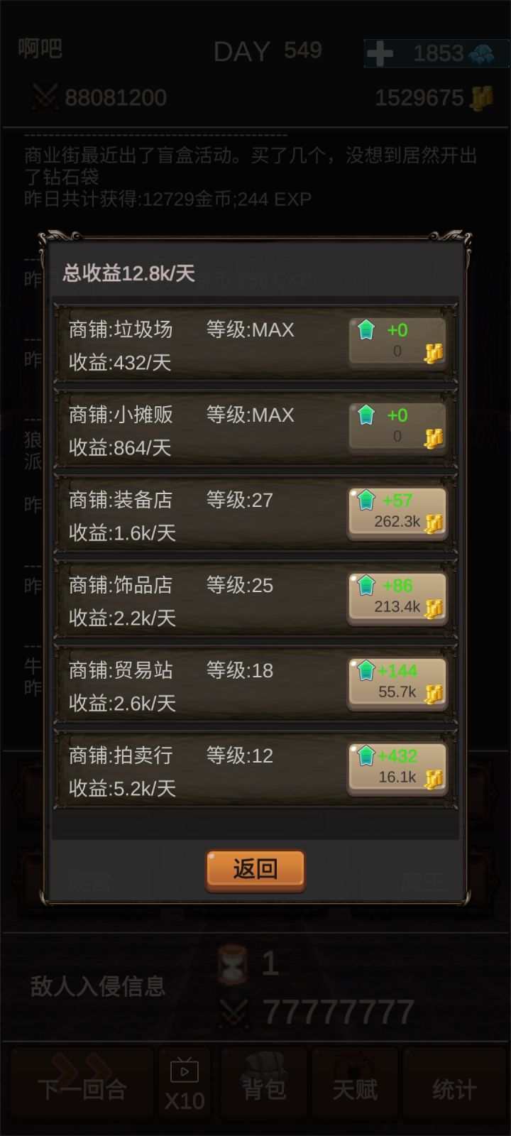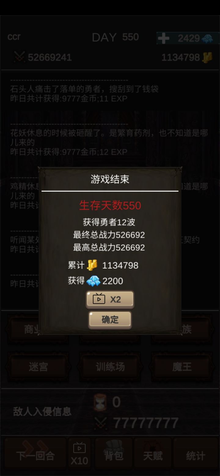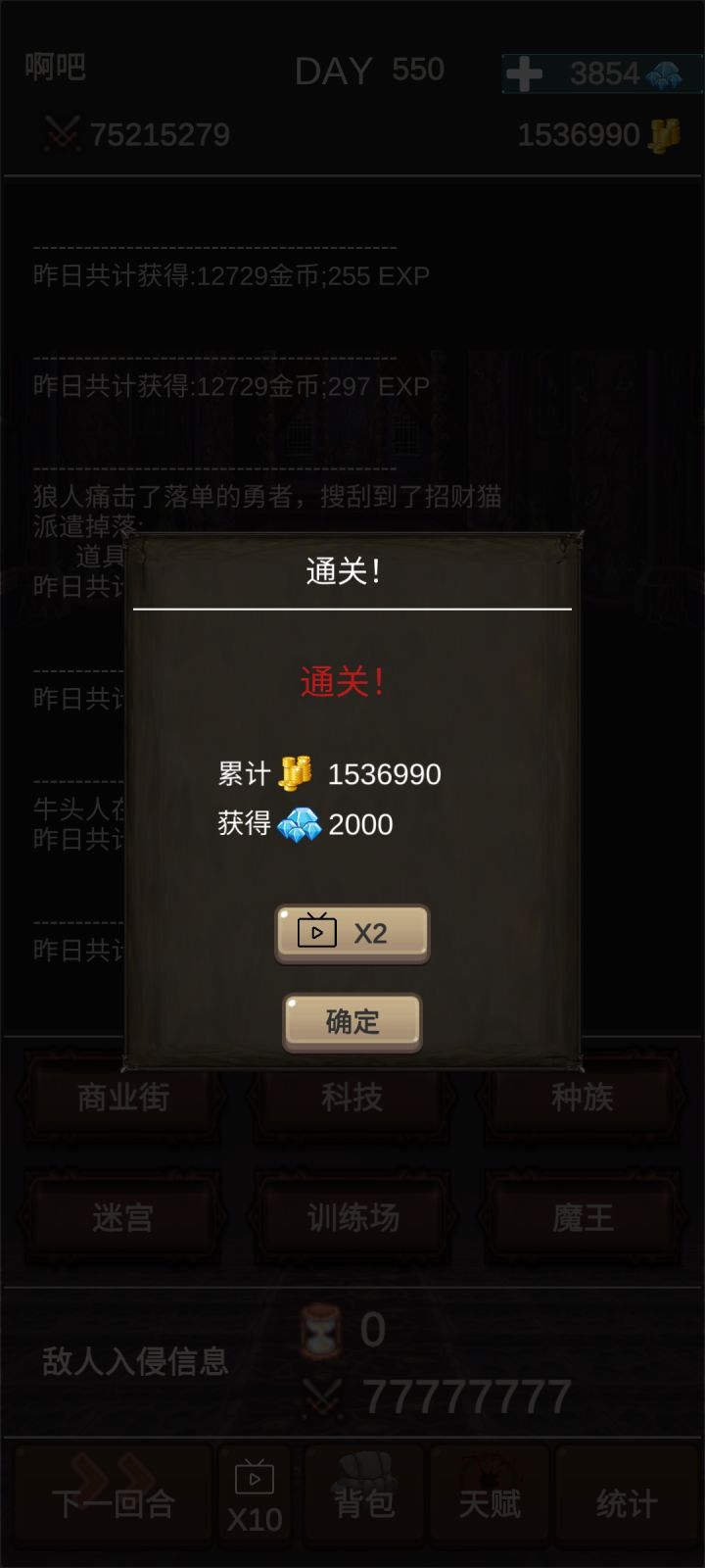 通关图天赋点了开局1000块,商业头脑和魔鬼训练全打完了,打到最后就是很多种族都没招,虽然说也没有必要招,但就是感觉缺了啥,而且龙的数量也没到900满,再加上一个广告也没看还有魔王也才两个。。就挺突然的,突然就通关啦开局直接买猫妖跟宝箱,再去买垃圾场小商贩,训练场先别摸,拉个猫去迷宫挂机,这样子就算是开局完成啦~第二步就是攒钱升级垃圾场和小商贩,升这两个到5级6级就要攒钱买5000商铺了。