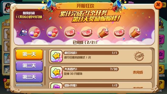 活动一:开服七日FUN欢乐,直送超强蝙蝠怪活动时间:新用户注册日起14天活动详情:1. 在活动时间内,每日登陆即开启当日的任务,达到相应的任务即可获得奖励2. 一共七日任务,当天只可解锁并完成当日及往日任务,未达时间的任务暂时不可解锁与完成。活动任务有9天时间供玩家挑战完成。3. 完成一定任务即可领取最终大奖:【蝙蝠怪】,奖励可领取时间截止至活动第14天,注意领取哦!4. 直接在游戏内