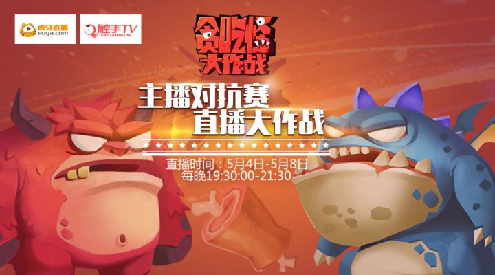 主播对抗赛 直播大作战 一群怪兽宝宝们的狂欢节 -贪吃怪大作战活动时间:5月4日至5月8日,每晚19:30:00-21:30(连战 5天) 丰厚奖励:”幸运挑战者”- 由主播每场指定玩家送出【章鱼稀有皮肤】x 20(或等价金币) “实力挑战者”-无论胜利or失败,匹配主播既有奖励挑战胜利,100星币/场挑战失败,30星币/场直播平台:虎牙直播/触手TV直播台信息:虎