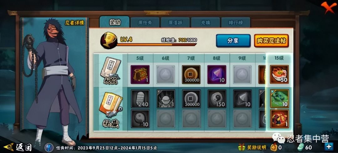 忍法帖解析 首先忍法帖分为两个档位,分别是25和198,在买完25或198任意一个档位后都会解锁等级,如果都任务完成度拉满的话,25档位最高升到160级,总计能获得80片忍者碎片,198档位最高升到200级,总计获得100片直接就是一个整卡到手。 每次忍法帖持续时间为四个月,我们可以充值点券用来买等级,最划算的必须是1980点券,可以直接升50级,但最多只能买两次,平时可以充点券续月卡,把点券存起