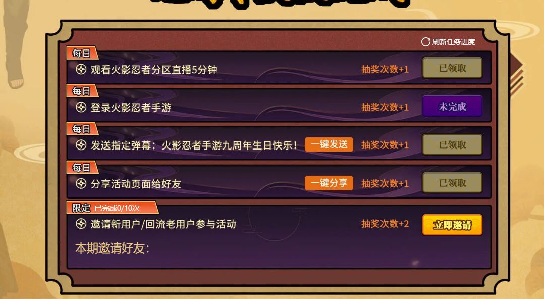 游戏里的不多说了,直说斗鱼这次九周年活动。搜游戏名进活动页 1、在这个页面拉到最下找到任务 2、做任务前先绑定火影号除了5分钟的,其他都秒领 3、做满一天最多4次机会 4、可以抽 AirPods、斗鱼头像框、198忍法帖、忍玉、金币等。 5、可以通过邀请新号或者回归的斗鱼号,可以多领2次,上限是10