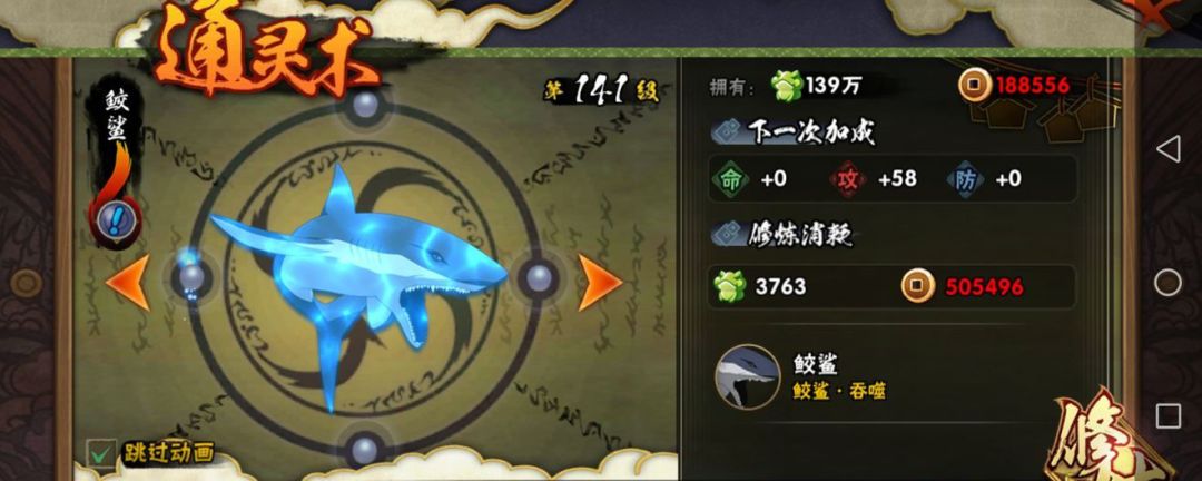 火影忍者中,鲨鱼满级是150级,可以通过卷轴和符文来升级。 一、升级道具: 1、卷轴。 卷轴是通灵兽升星的唯一材料,但是每个通灵兽升星需要的卷轴都不太一样。 卷轴可以通过商店购买和试炼之地大BOSS处获取。 2、符文。升级通灵兽则是需要收集各种符文,收集一定的符文,进行装备,然后当装备达到数量的时候,就有机会获得升级。升级之后,通灵兽的技能就有更大的伤害。符文可通过试炼之地获得。 二、通灵兽的获得
