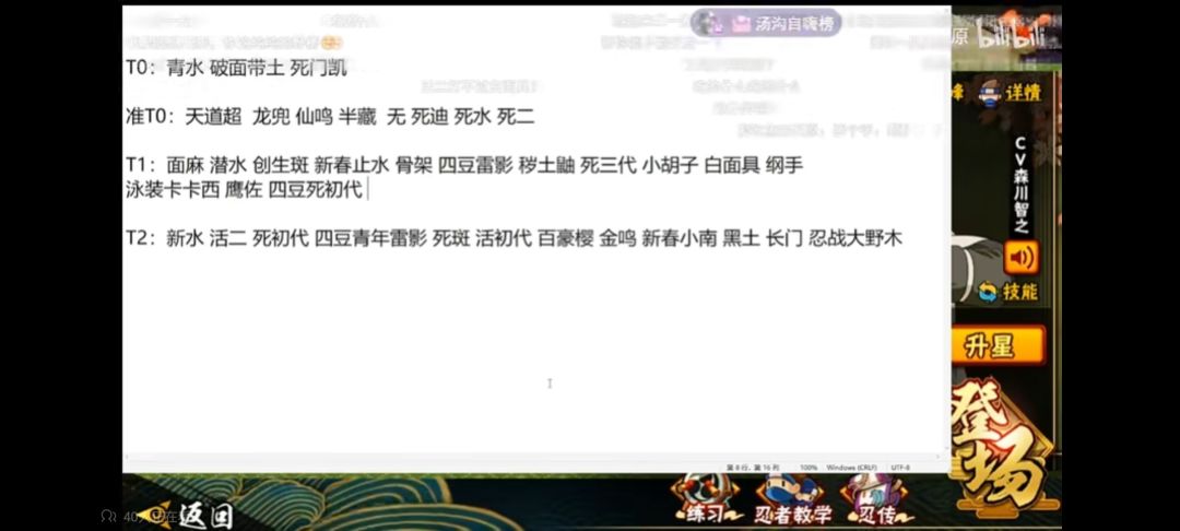 这次汤汁豪算是难得正常一次,没有说瞎几把搞偏袒放一堆自己觉得强但是客观强度很拉的忍者,这次他的排行算是比较客观的。 有的人也会说他的排行是排给高分段人看的,不够客观,但我想说的就是,他这排行里的忍者都有花上时间练习就能上大分的潜力,青水这个就算了,下版本马上死,别的忍者基本上没有变化,强度依然有所保证。 t0方面剔除了青水,你像带土和野✓这两个其实要吵也没啥吵的,带土就算下版本修复双火双树枝bug