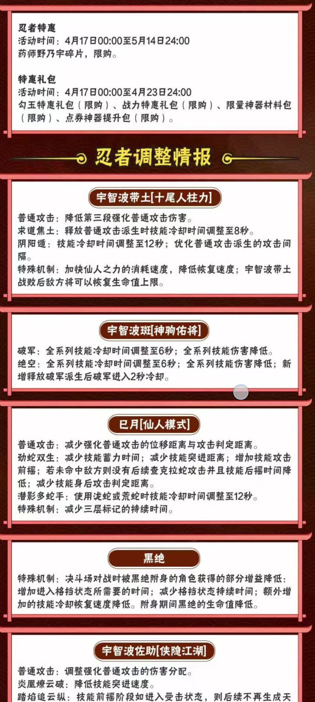 魔方一个默认的规则就是,让充钱的优先享受,所以有一些忍者短期之内是不会动的,比如马斑最逆天的时候,官方选择削弱老自来也、解斑和六尾