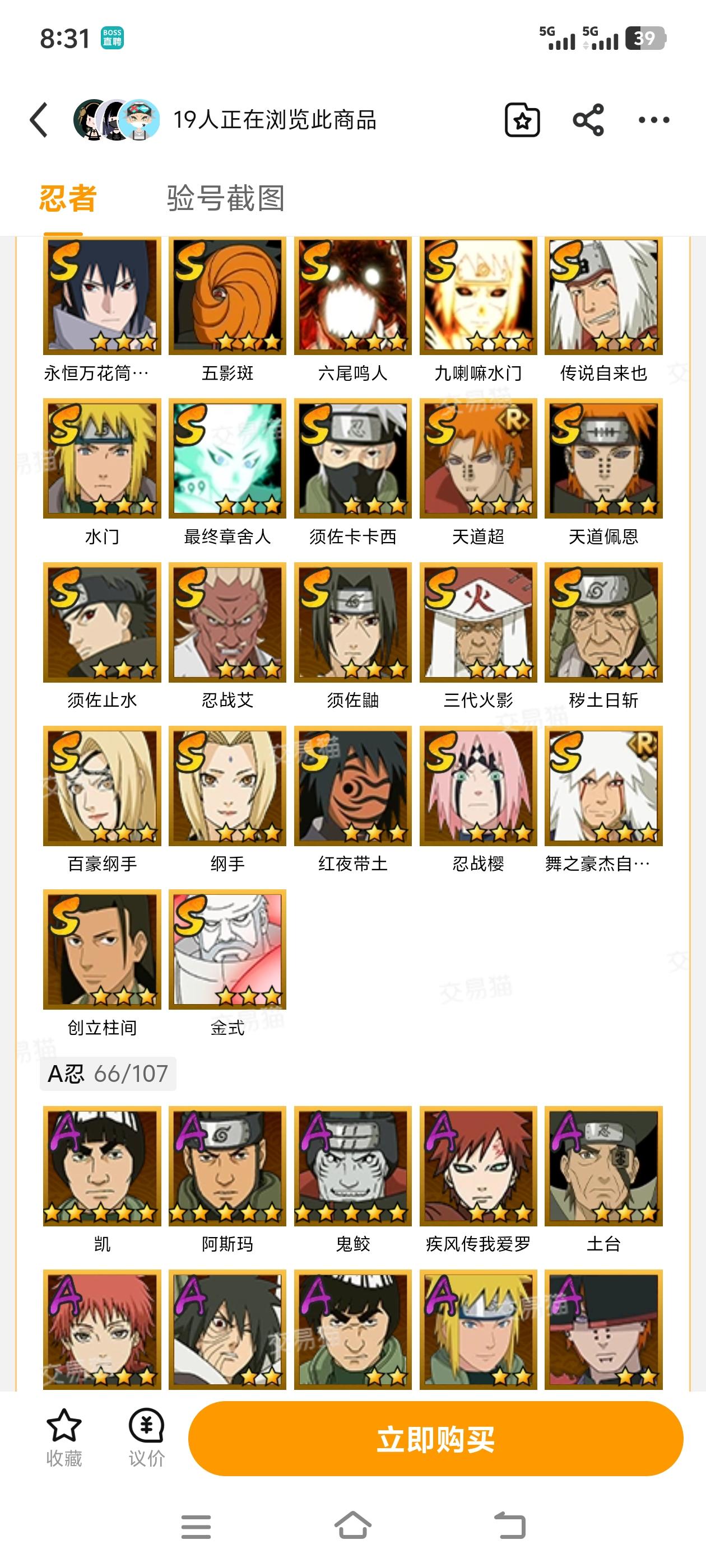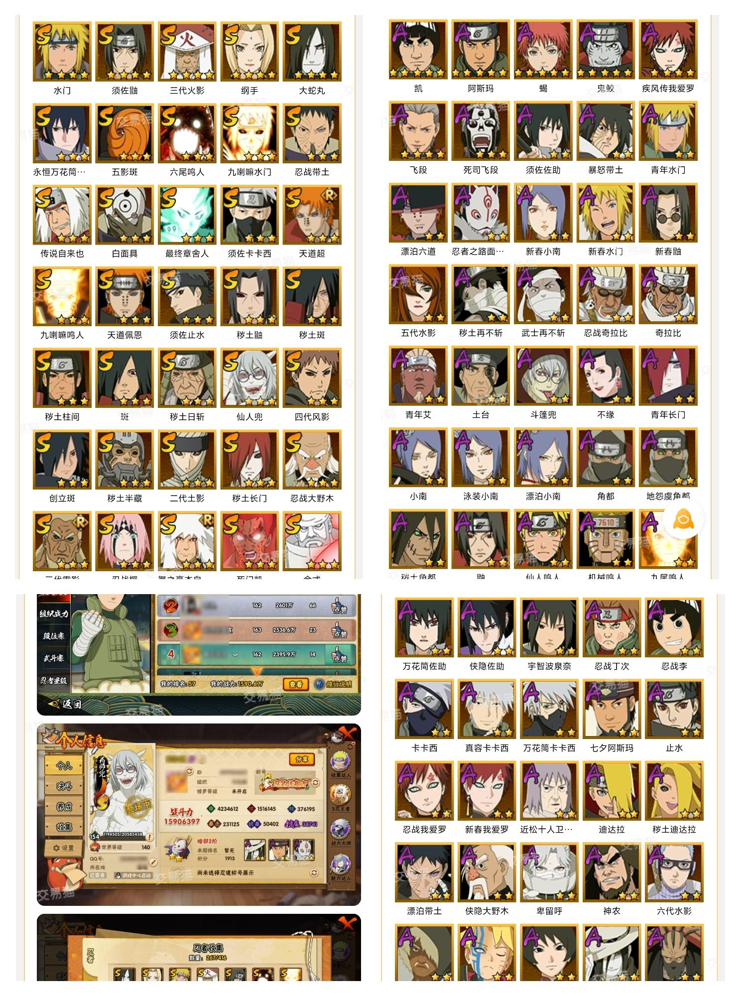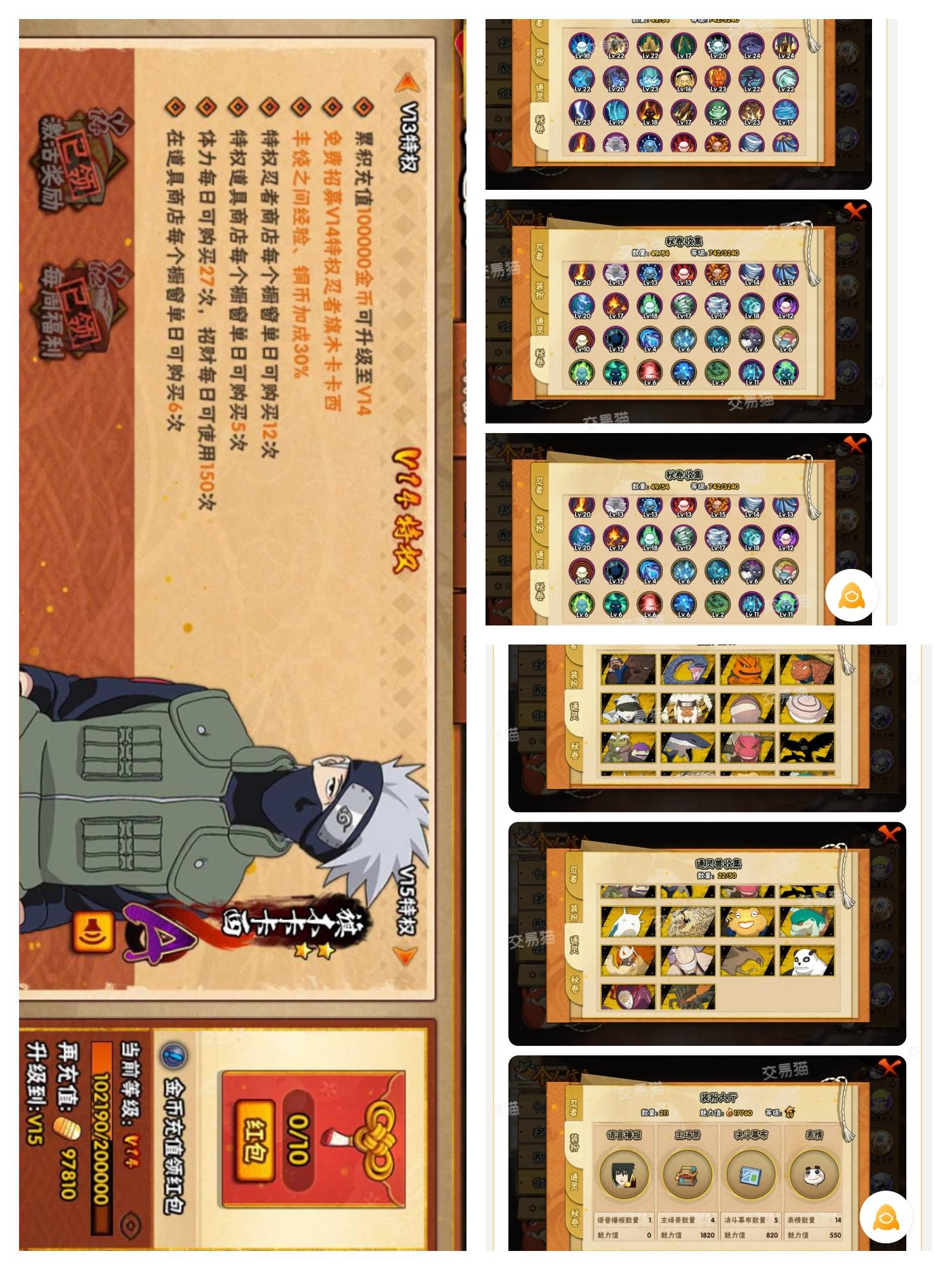 前四张是一个号,后四张是第二个号 第一个号v13,战力1237w 1020块 第二个号v14,战力1610w 1050块 第二个号创立柱间85片在下个忍法帖冲个月卡就能获得限时点券没动,号上有真点卷1496 第一个198有34个(小孩跟忍战凯当198)98通灵有7个,第二个算上下个忍法帖跟创立柱间28个就一个熊猫