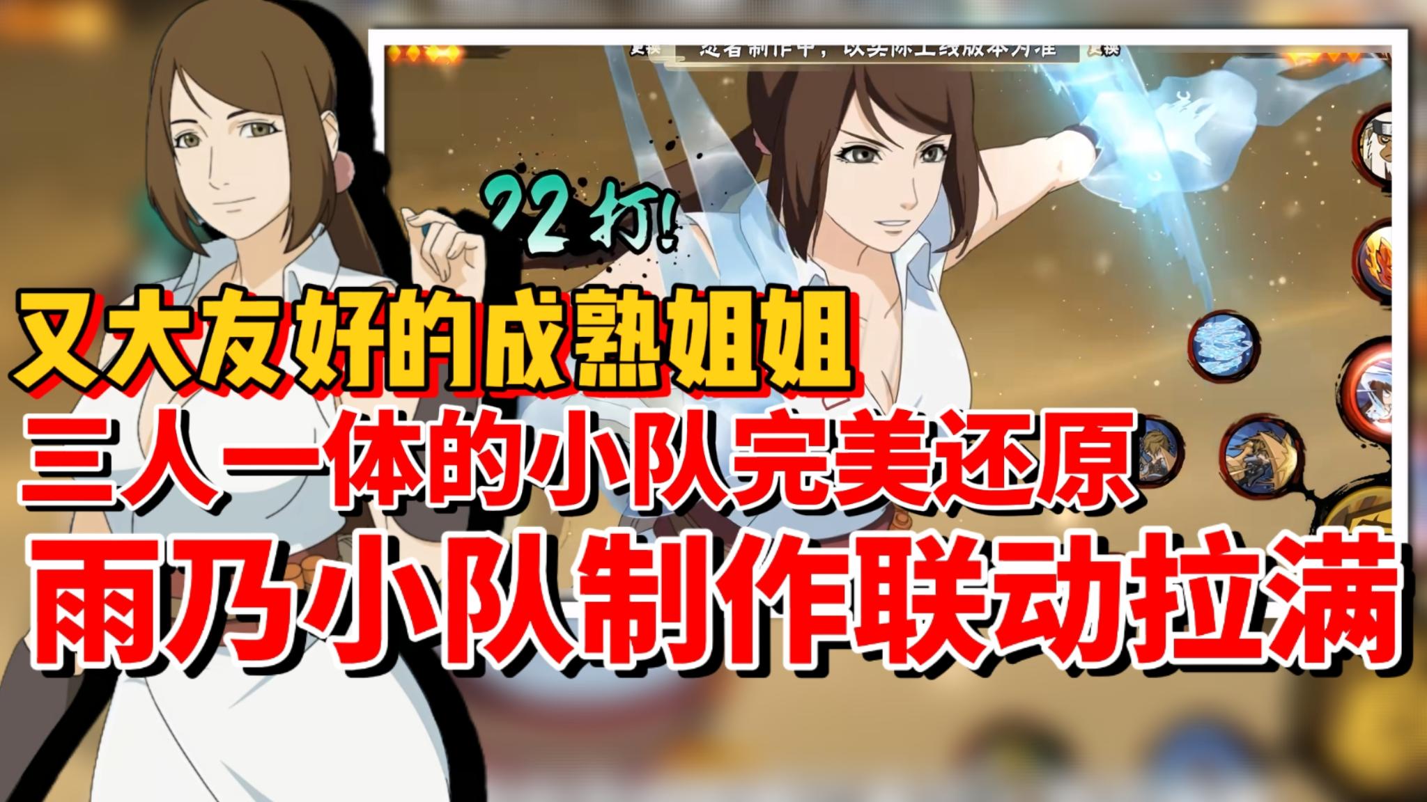来自砂隐村的医疗忍者——雨乃,她不仅擅长医疗水遁忍术,还有两名队友助阵,发挥协同作战的优势!接下来和豚豚一起看看她的表现吧!特殊机制雨乃可通过普攻3A划上下摇杆、二技能、二技能的下子技能呼唤队友志志雄或光司并肩战斗。任意队友在场时,释放二技能则会打出该队友的对应招式。场上最多只能存在一位队友,队友在场上时为金刚体。三人的血条各自独立,但共用二技能CD。若一位队友血量耗尽,无法通过普攻或二技能唤
