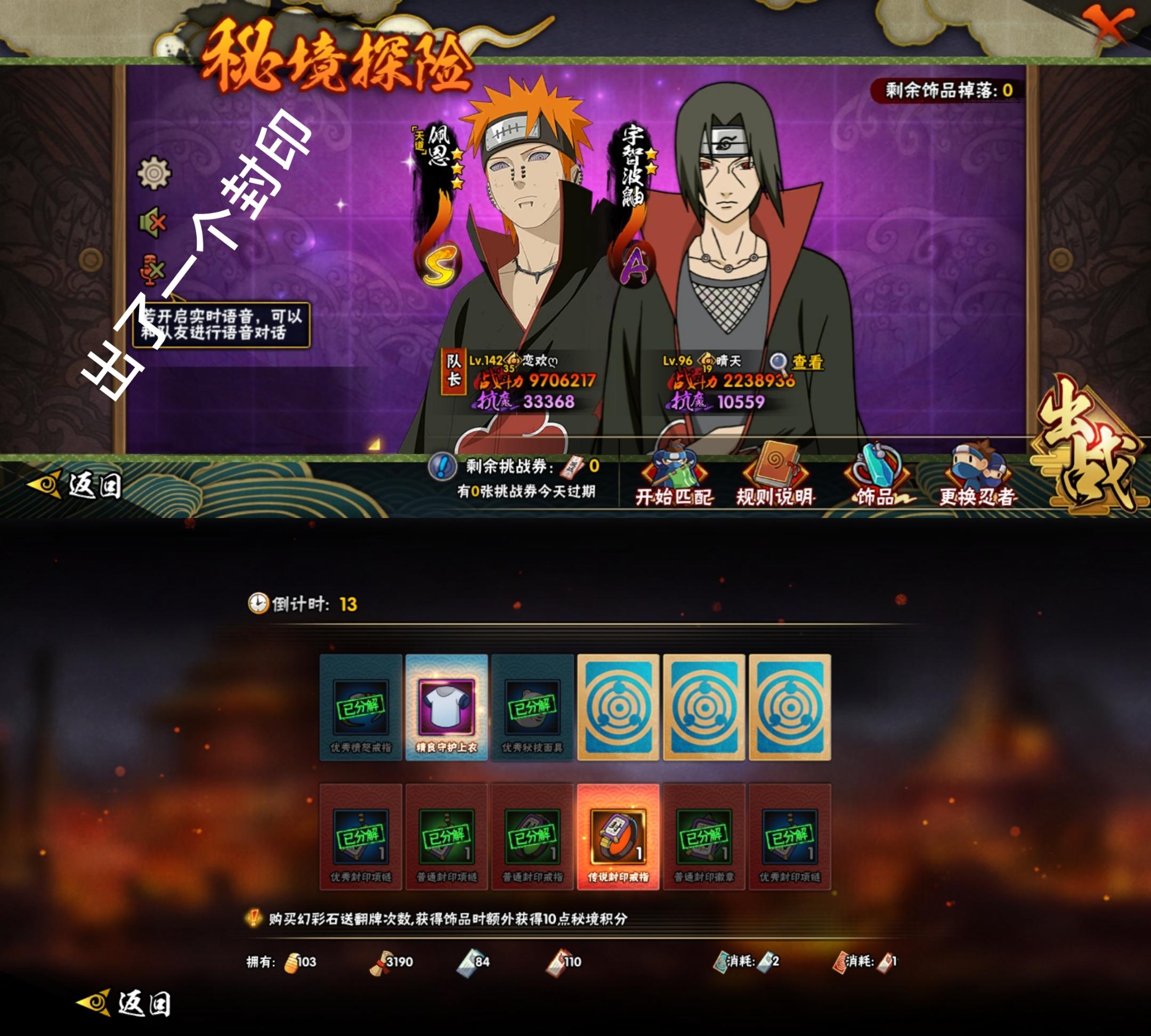 漩涡鸣人·宇智波佐助装备传说时装“宿命连结”同样为双人作战忍者,学员们可以在忍者界面和备战界面切换角色登场顺序。两个角色共用CD、奥义点,且双方拥有独立血条,普攻、技能均不同。在角色普攻或释放技能时可点击奥义键切换角色;豚豚小提示:若在攻击时换人,原本角色在打完当次攻击后才会消失哦!鸣人或佐助血条下方各自有两格能量条,能量各自独立不共用,每次释放技能会消耗一格能量,当前登场角色的能量随时间缓慢恢