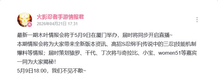 🎤 火影5月9日木叶情报会定档厦门!纲手三忍技能首曝,策划猿罗千代丁次携手奇拉比小宝空降现场 由万代南梦宫正版授权、腾讯游戏研发的唯一正版火影格斗手游《火影忍者》 近日传来喜讯,最新一期木叶情报会将于5月9日在厦门线下举办,当晚18时同步开启线上直播。策划猿罗等嘉宾将陪同玩家一同揭晓全新高招S忍纲手[传说中的三忍]的完整技能机制。作为五代目火影千手纲手的高招版本,该角色预计取材自三忍时期巅峰