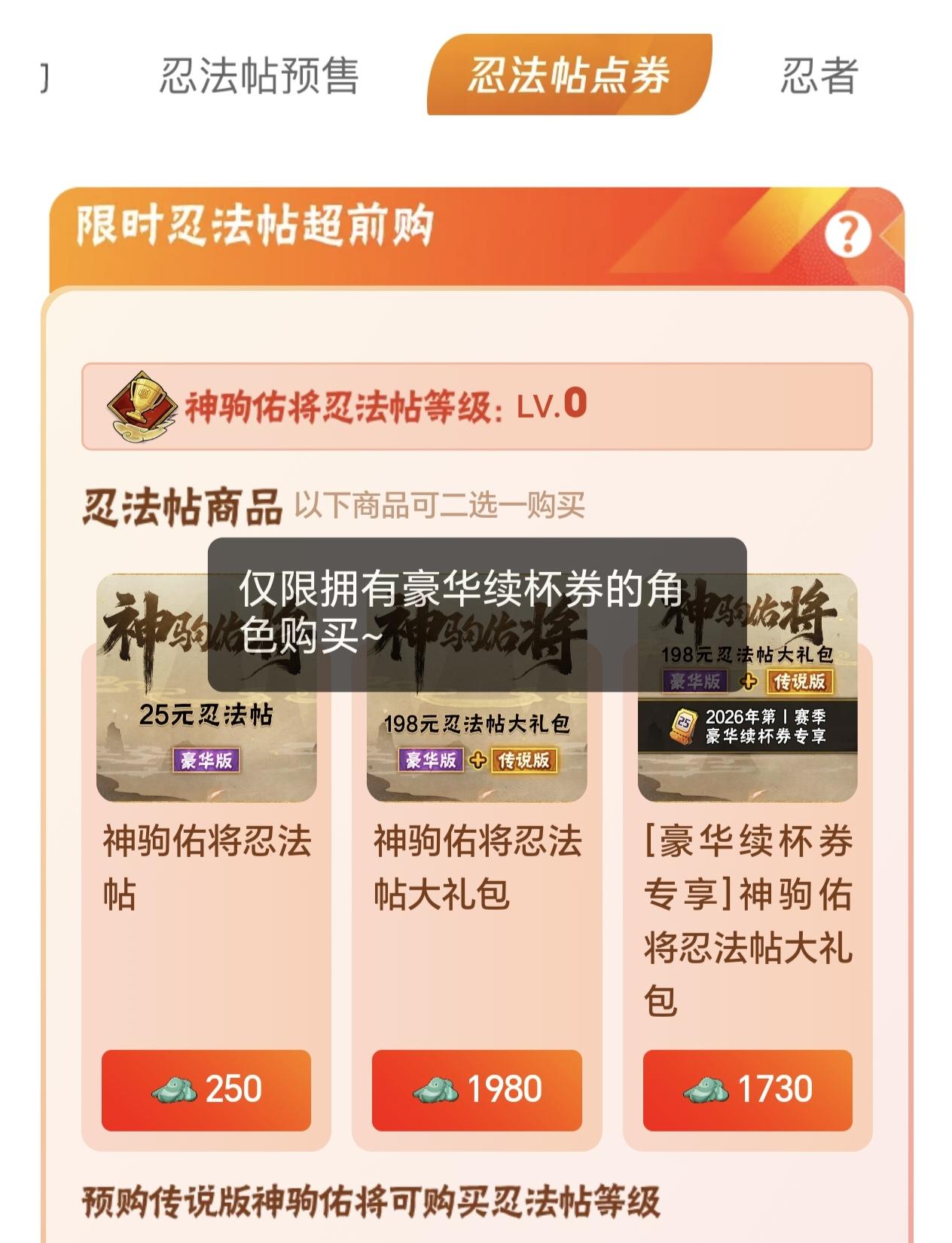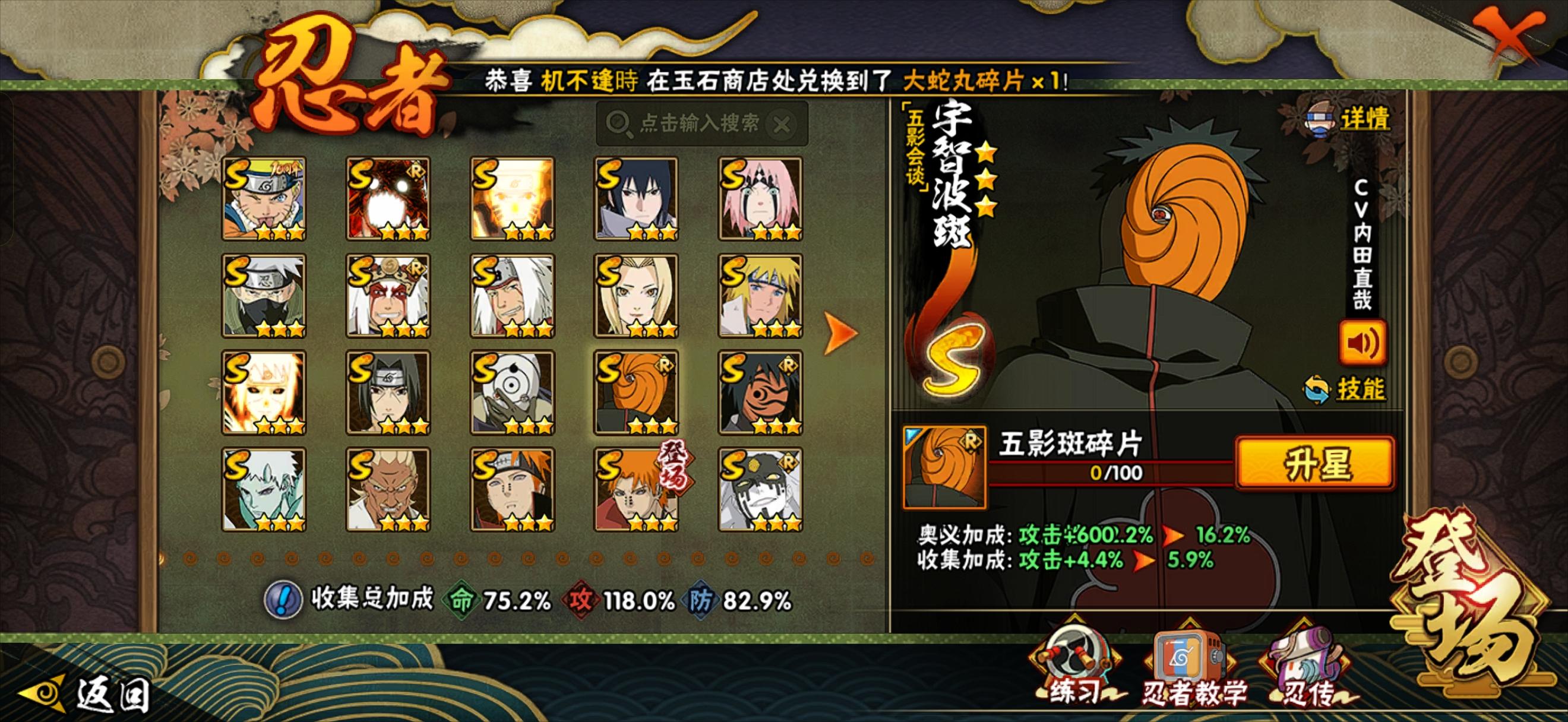 这号值不值105014个点券A忍 侠影佐助 无影会谈斑开了198 创立柱间82个碎片 秽土水门63 忍战雷56片 有1400多的点券,下一个忍法或点券A再充个月卡就有了