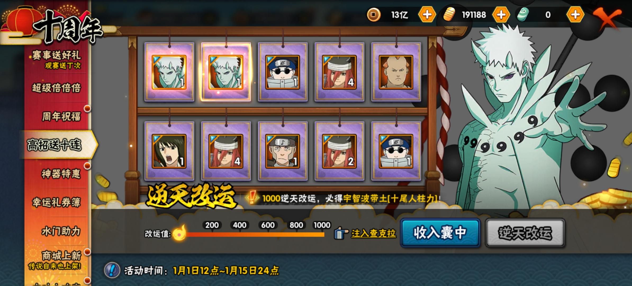 还是很意外的和感到惊喜的,但运气依旧,一直两片已经习惯了秒还是会秒的,只不过V0得维持4天一百抽,毕竟V0有限制,下一次秒的S忍应该是十尾人柱力斑(六道斑)和六道鸣佐了吧
