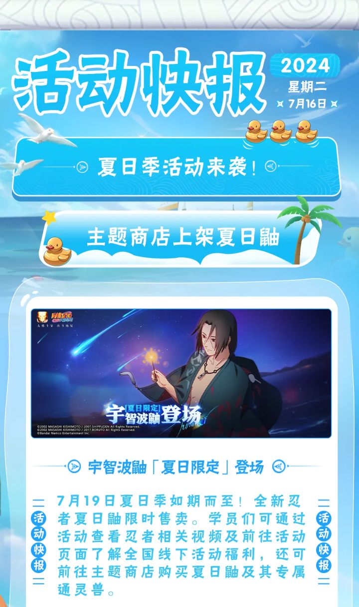 等一个自然而然的晴天,想要带你去海边!夏日忍者们都在海边享受悠然夏天,豚豚特意将这些美好瞬间一一定格,和学员们一起欣赏~宇智波鼬「夏日限定」
