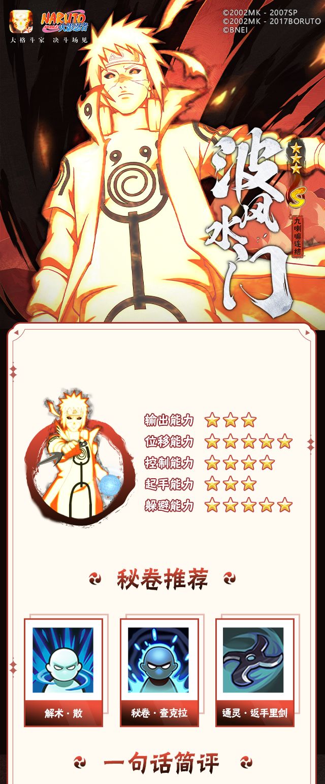 九喇嘛水门的机动性较强,可以提前特殊普攻慢A插标,在战斗中快速换位到插标位置;在能量条满的情况下,还可以在释放技能时按“阴”之力,消耗能量条强化攻击,利用化身阴九尾时的金刚体加强反手能力。