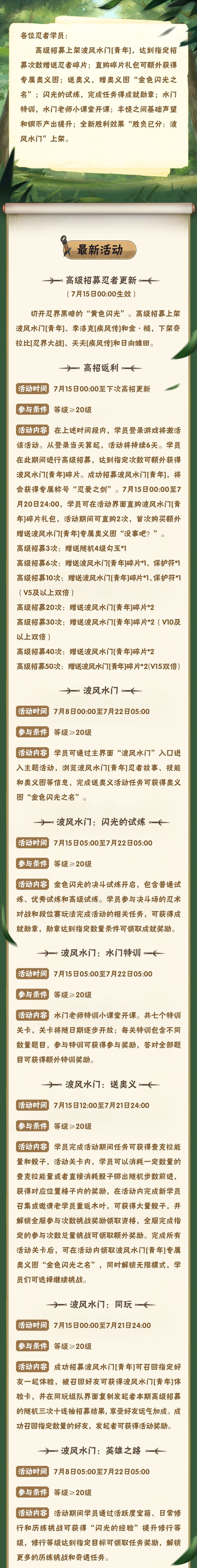 神秘海报 悬念揭晓朦胧的光照在一份信件上,被利器划过的痕迹,让信件显得更加沧桑。略显斑驳的字迹虽然浅淡但尚可阅读,而被红笔圈中的两个字,似乎正预示着某些关键的“真章”……被撕扯开的纸张背后,一个大家似乎并不陌生的身影映在眼前。昏黄的灯光渗透进屋内,双截棍静静躺在兵器架的最顶端,为这场“无形的试炼”增添了一份记忆中的热血……通过这套充满悬念的图片,豚豚要揭晓两则重要信息——今年7月22日,游戏内