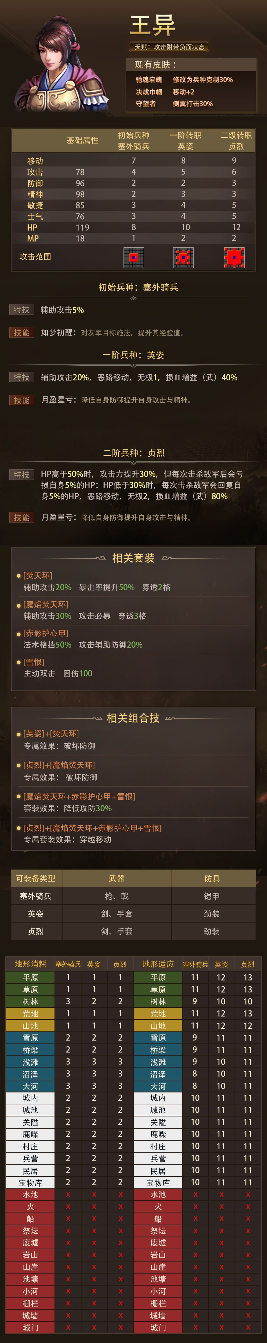 活动时间:2022/04/07~2022/04/21 一、新增武将转职/套装 1、曹仁 新增天赋:能力重算,辅助防御10%。 曹仁一阶[据守]:辅助HP50%,反击强化50%,嘲讽,反后反,敌军回合可中心三格范围反击; 技能组: 以守为攻:持续2回合,冷却5回合,自身防御辅助攻击20%; 安营扎寨:将地形改为兵营,持续2回合,冷却5回合,同时提升自身防御力; 无所畏惧:对目标及周边单位部队提升其防