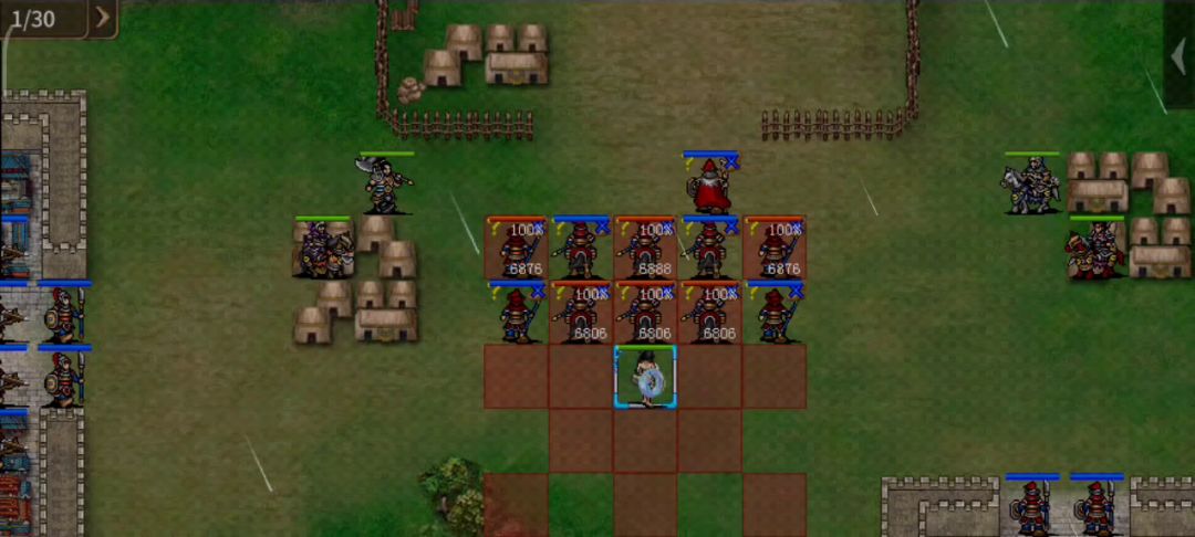 7.戏魏64关全攻略教学关(共20回合)宝物:3级长刺(穿透攻击2格),5级剑,5级铠单挑:单挑:夏侯渊VS张飞(降攻防)没什么好说的,为了防止萌新打不过,大可特意添加了我军自动回血,属性上也是碾压敌军,想打不过都难。夏侯渊单挑张飞,张飞减攻击防御能力。击退刘关张,进城对付董卓。占据有利地形,抢占城池和兵营,轻松团灭对手。胜利条件是到达地图右侧。戏魏游戏正式开始!满级模式我军全人物都是