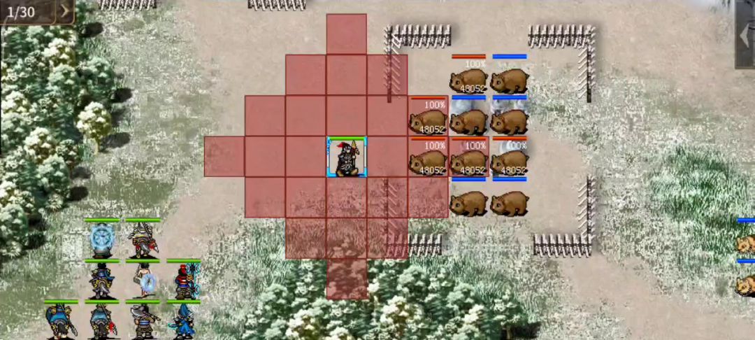 7.戏魏64关全攻略教学关(共20回合)宝物:3级长刺(穿透攻击2格),5级剑,5级铠单挑:单挑:夏侯渊VS张飞(降攻防)没什么好说的,为了防止萌新打不过,大可特意添加了我军自动回血,属性上也是碾压敌军,想打不过都难。夏侯渊单挑张飞,张飞减攻击防御能力。击退刘关张,进城对付董卓。占据有利地形,抢占城池和兵营,轻松团灭对手。胜利条件是到达地图右侧。戏魏游戏正式开始!满级模式我军全人物都是