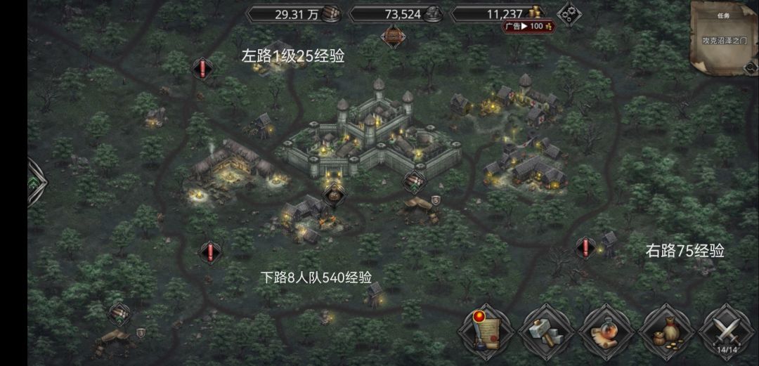我说个快速练级的方法,主城左边破马车会刷出1级3人练级队击败得25经验,主城右边破马车刷出5级练级队3人击败得75经验,主城下路方向刷出15级8人强力队击败得540经验。以上三路练级队每天只能随机刷出一路,但是可以控制让系统只刷你想要的那一路,方法改手机系统时间过一天需要连续改三天,让三路练级队都满了,然后只打你想打的那一路练级队敌人,打完不要动其他那两路敌人不然会随机又沦为刷新。反正打完你要练级的那路后就该手机系统时间下一天就会刷新出你打的那队练级队了,不过有时候会刷不出那就继续改下一天