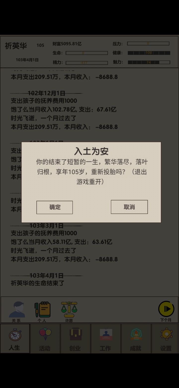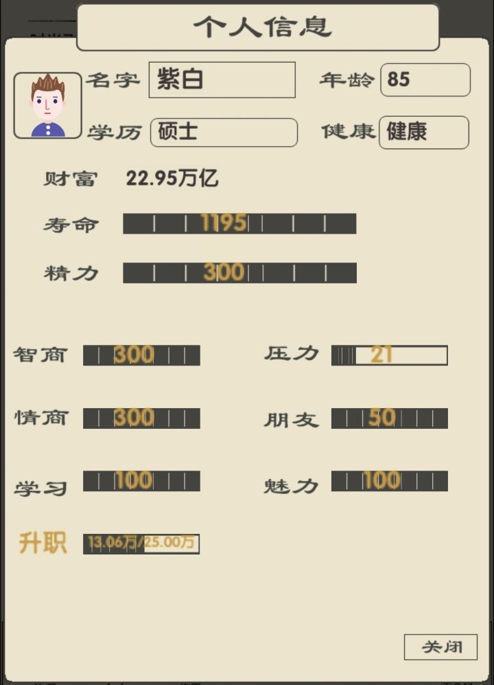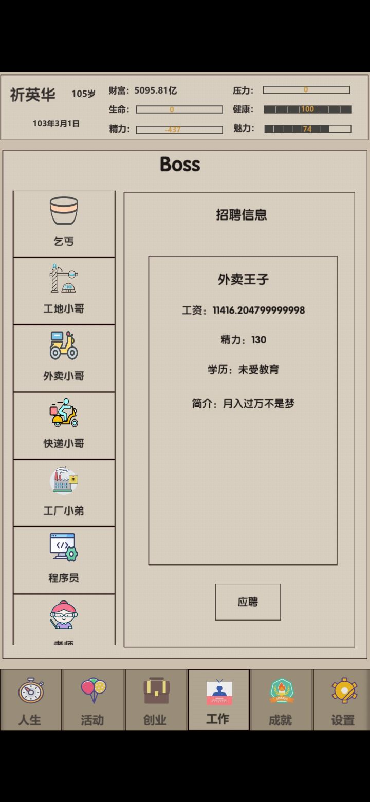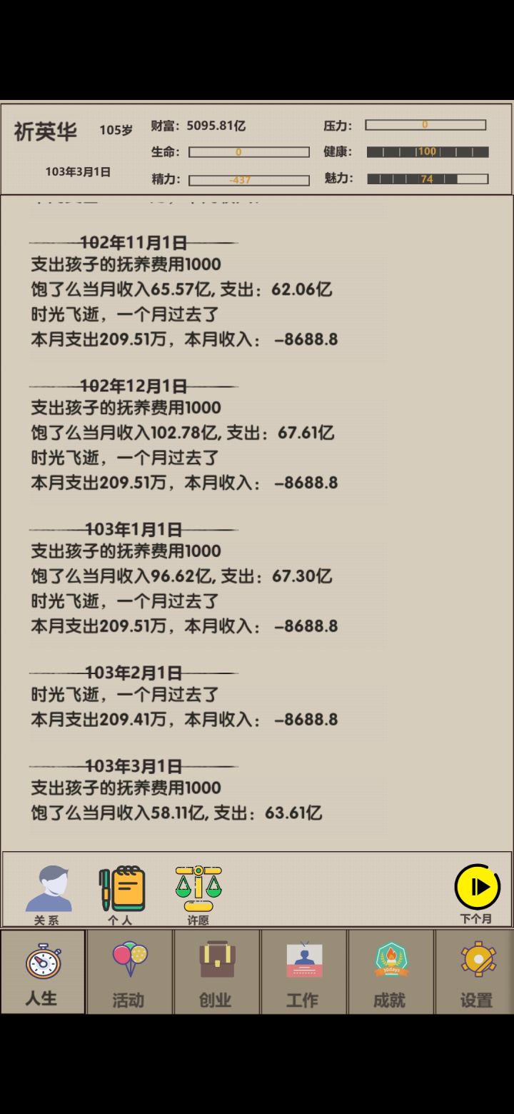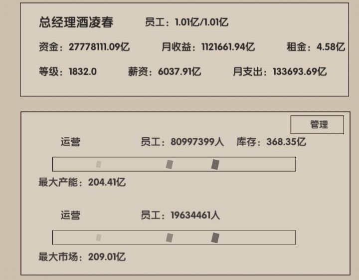 看着年过半百的人生,我很茫然,靠着当演员,又攒了100W。 我不甘心!这一次我要拿回属于我的全部! 我放弃了饱了么公司,看向只要10W就能创业的丐帮,我知道我有一百万,我有资金供我试错,但我不想我的人生就这样错下去了。 我开始小心翼翼,我只招5个员工,第一个月全部生产,再招聘最好的CEO,虽然第一个月亏损严重,但我的库存瞬间充盈,我开始调整员工,保持生产与销售平衡,虽然还在亏损,但我有100W而且我的的员工很努力,销售点在不断提升逐渐超过了生产点,慢慢的不在亏损,我的销售很棒,我知道我要抓紧生产了,于是我招满了员工,重新调整平衡。继续稳步正收益。我的野心不断变大,我开始扩产,招员工,挣他一个小目标。