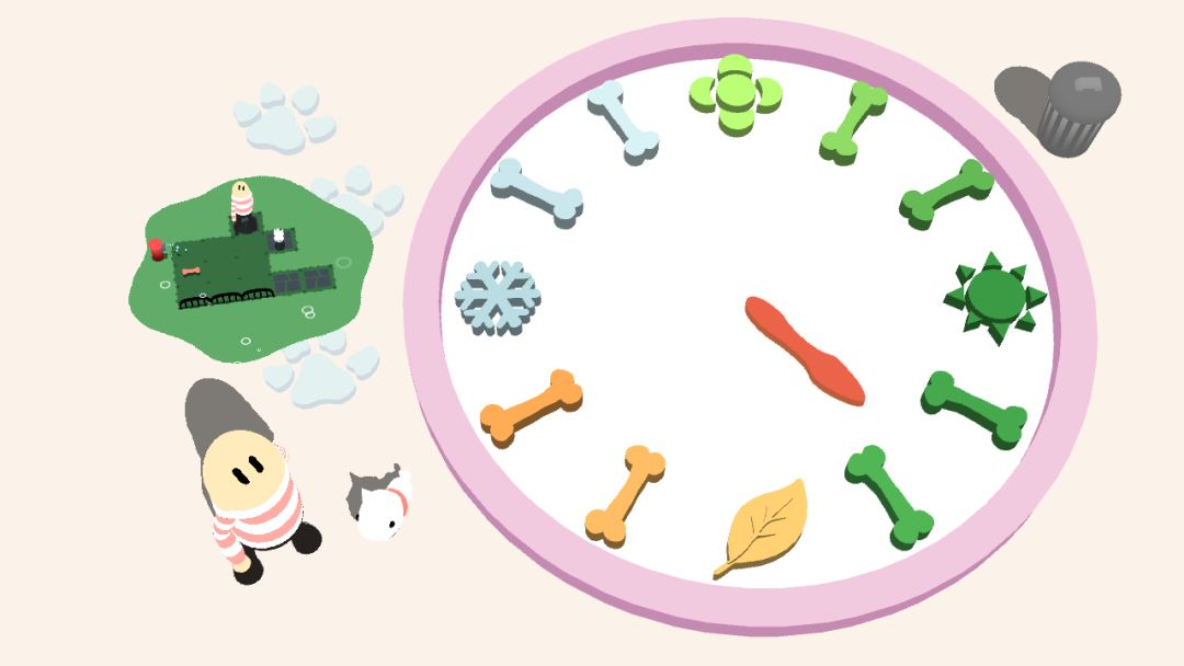 我们认为遛狗其实是一件体力和策略并存的事情,小狗在遛狗时总是会被一些其他因素吸引注意,不按预定路线行走,以此为灵感我们在经典的一笔画玩法上增加了一些机制组成了该游戏的玩法。同时通过将这些机制逐步添加和组合在关卡中,逐步增加游戏关卡的难度。