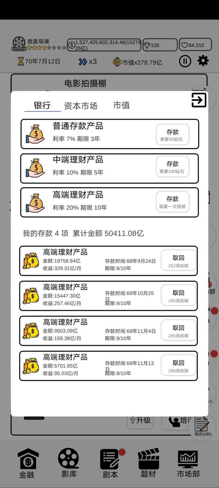 游戏很大一个问题就是银行了,根本不用拍电影,不管多少钱,银行最高利率拉满,每个月得到的比拍电影还高。本人亲自实验,第五个10年已经一千多亿元,每月收入近二十亿,这种玩法思路是看广告20%,另一种收益减半的不看广告也行。所以说根本不用看广告解锁剧本,直接银行玩法就行了。当然限制也很简单,直接限制最多只能存多少在银行就行了。就看开发者怎么改进了,目前的另一个问题就是看广告的地方太多了。其实优化做法很简单,看广告解锁剧本和其他东西变为以钻石解锁。只需要限制每天获得钻石数量就行了。目的一样能够达到。