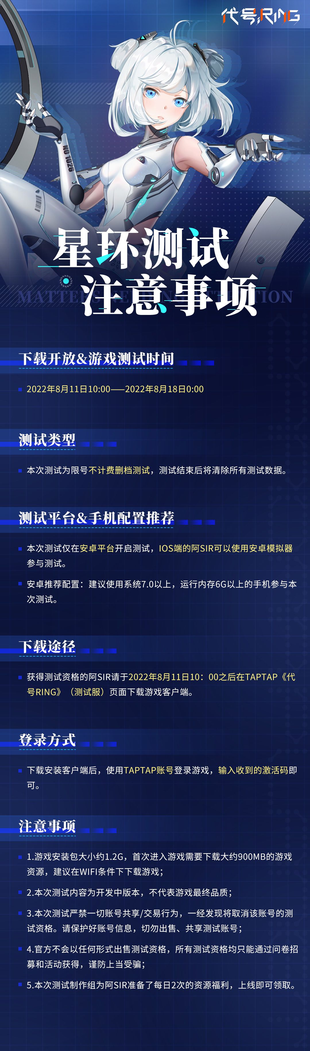各位亲爱的阿sir: 大家好! 星环测试即将启动!测试资格将于8月10日内由tap站内私信发放,请获得测试资格的阿sir及时查看站内信,方便第一时间登陆萨达尔星。 以下为星环测试最新情报,请阿sir查阅。 >>下载开放&游戏测试时间 2022年8月11日10:00——2022年8月18日0:00 >>测试类型 本次测试为限号不计费删档测试,测试结束后将清除所有测试数据。 >>测试平台&手机配置推荐