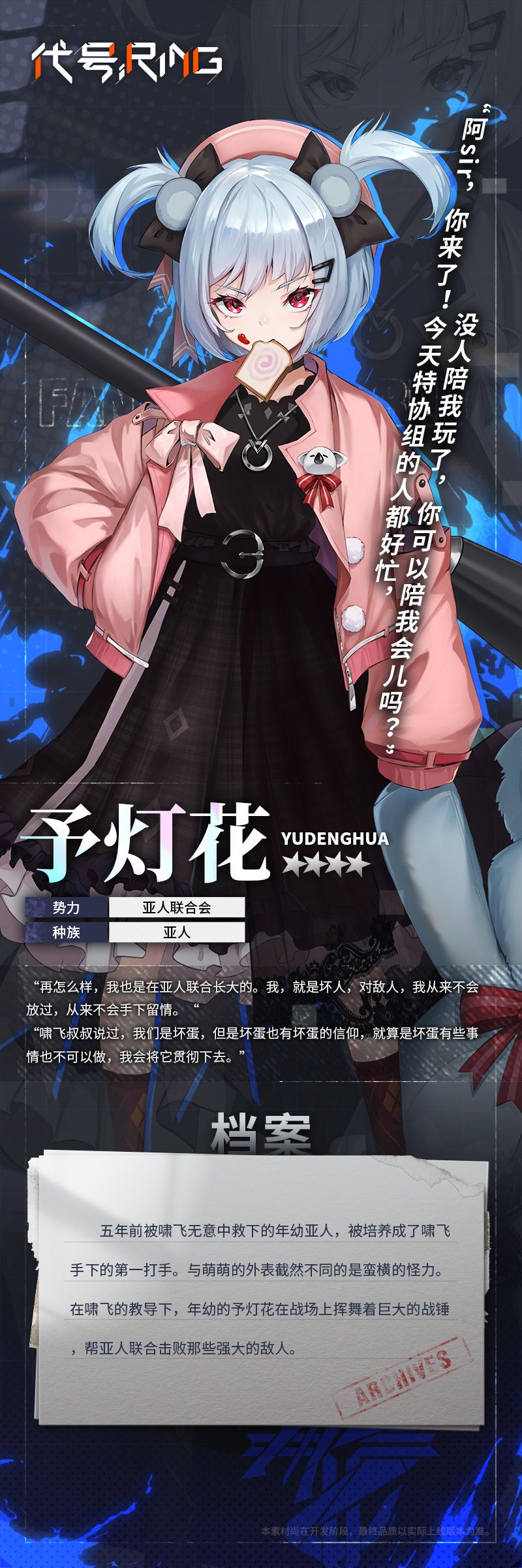 势力:末源族/身高:167cm/生日:8.26 炽星裂,末源方舟上第一批苏醒的战士。暴躁的脾气与火焰成为了她独特的标志。强悍的行动力与战斗力总是让女王感到头疼。 注:该视频仅为角色印象资料,最终品质以游戏正式上线为准。