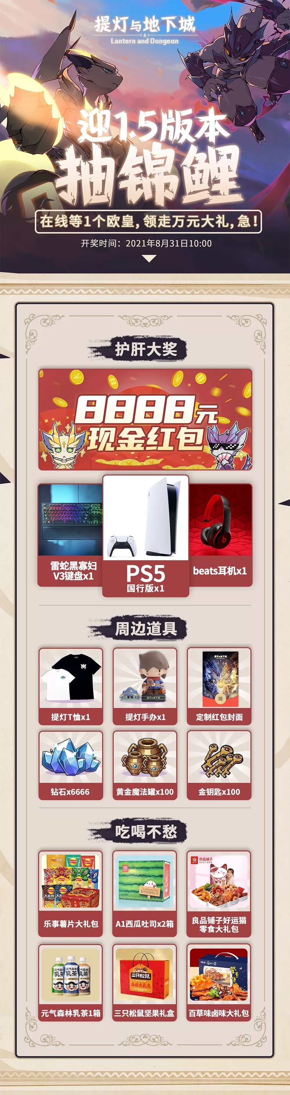 亲爱的冒险家 大家好,我是你萌的好兄弟西瓜~ 为喜迎《提灯与地下城》新版本上线! 这不,西瓜我今天来给大家送福利啦!8888元现金红包、PS5游戏主机、手办、零食应有尽有! ⭐参与步骤⭐第1步:在《提灯与地下城》公众号后台发送【是兄弟就来提灯】,即可收到自动回复的分享长图&抽奖链接! 第2步:按自动回复的提示进行操作,保存图片并分享(很重要!),最后点击链接,即可打开小程序进入抽奖页面! 西瓜ti