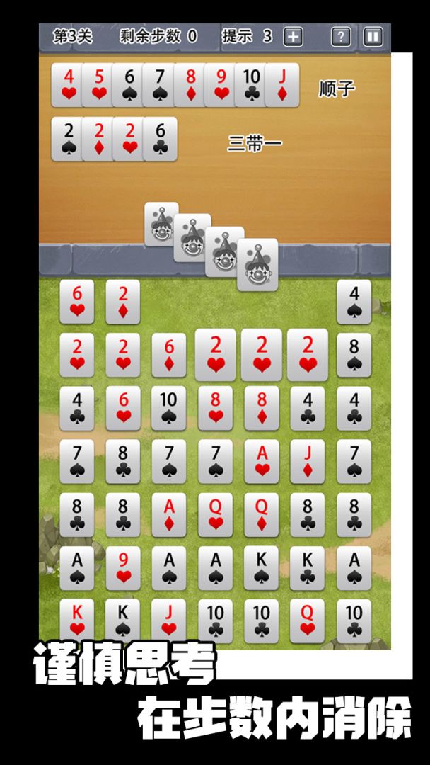这是一款以斗地主牌型为消除逻辑的益智游戏,按顺序连接相邻的牌使它满足斗地主的牌型规则即可消除这些牌,每一关需要在一定的步数内消除所有的牌,目前总共113关!