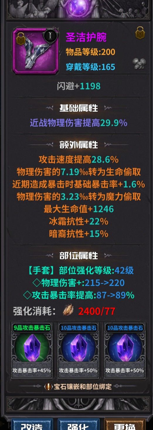 本游戏的重点是词条,不是装备。有点橙装看起来很刁,其实没什么用。如图所示,右边的橙装不管是装备等级还是品质都好于左边。但是,好看归好看。其实没用。这个游戏橙装词条是固定的。右边只有一条额外伤17对提伤害有用。左边的则不同了。近物伤18额外伤11面板370额外物伤13还有一个总体30的加成。右边能带来的提升只有左边的五分之一。所以,除橙武器外,建议带洗好的紫装。你要问我没紫装怎么办?我不会告诉你,