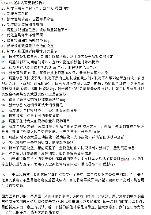 我们正在加紧努力的制作新的内容,并时刻根据玩家的反馈和建议对游戏进行调整优化,游戏可能不同于大部分的放置类游戏那样简单的通关累计属性,可能稍微有那么一丢丢的难度,我们的目标是做一款玩家玩得爽,又耐玩的暗黑放置类游戏,希望有想法的玩家可以多多给我们建议和改善的意见,再次感谢大家的支持~